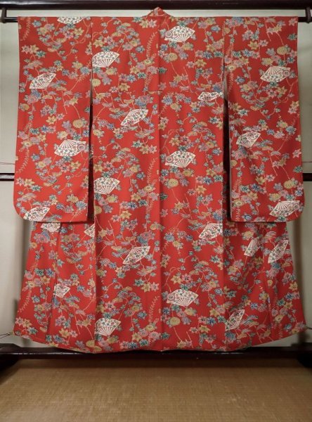 L0204Z Used Japanese women Vermilion FURISODE long-sleeved / Silk. Chrysanthemum, (Grade A+)