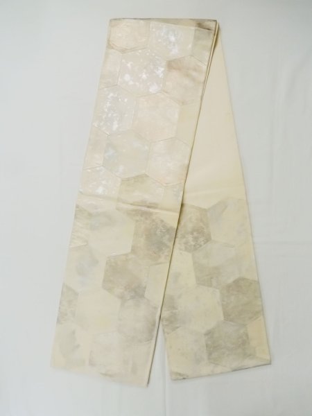 L1012B Vintage Japanese Kimono Off White FUKURO OBI sash Tortoise-shell pattern― Hexagonal pattern Silk. (Grade C) [L1012B]