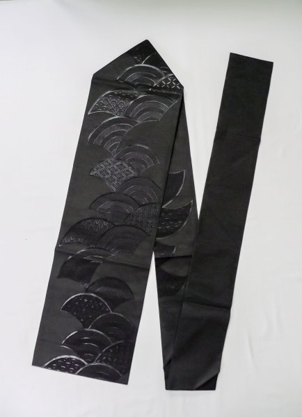 M0525R Vintage Japanese Kimono Black NAGOYA OBI sash Wave Silk. (Grade A) [M0525R]