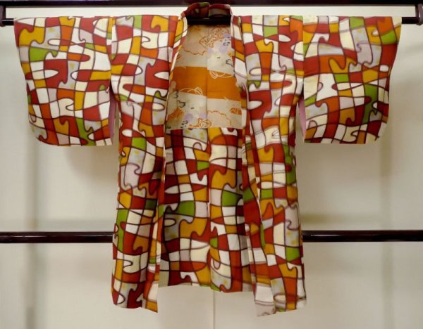 - > M0907W Antique Japanese women Vivid Multi Color HAORI short jacket / Silk. Abstract pattern (Grade C)