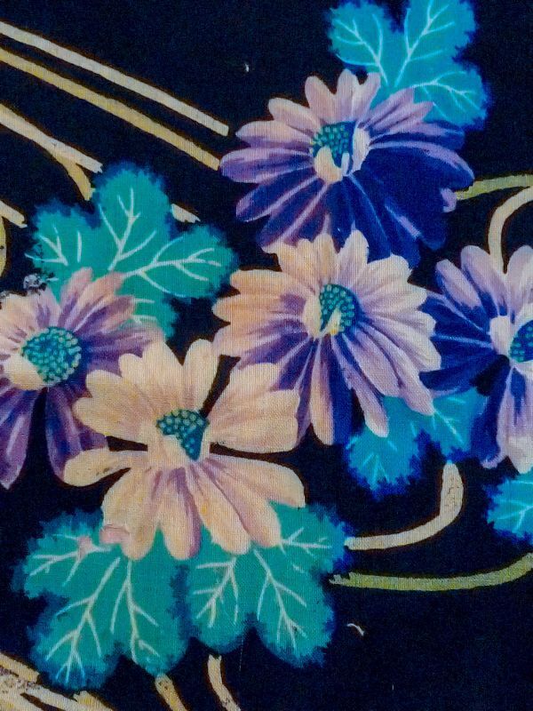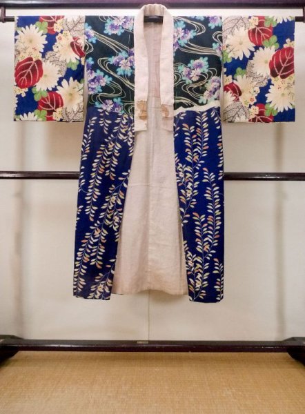 M1108G Antique Japanese women Vivid Blue JUBAN undergarment / Wool. Chrysanthemum, (Grade D) [M1108G]