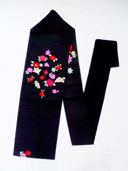 N0216D Vintage Japanese Kimono Black NAGOYA OBI sash Chrysanthemum Silk. (Grade B)