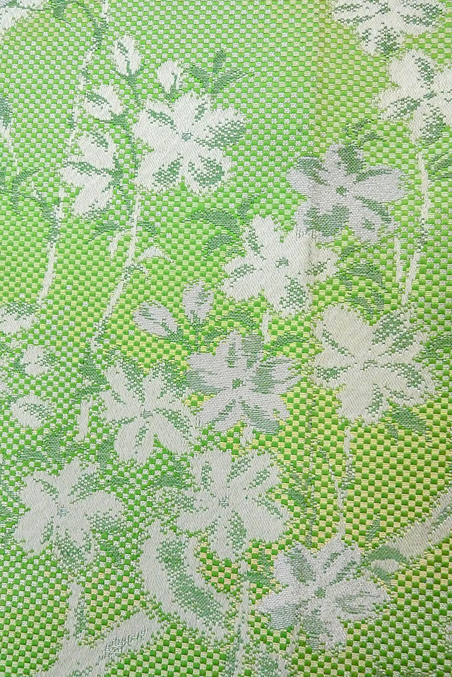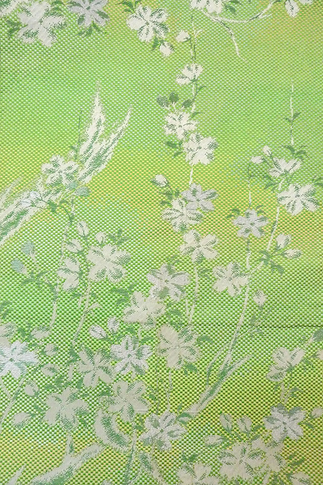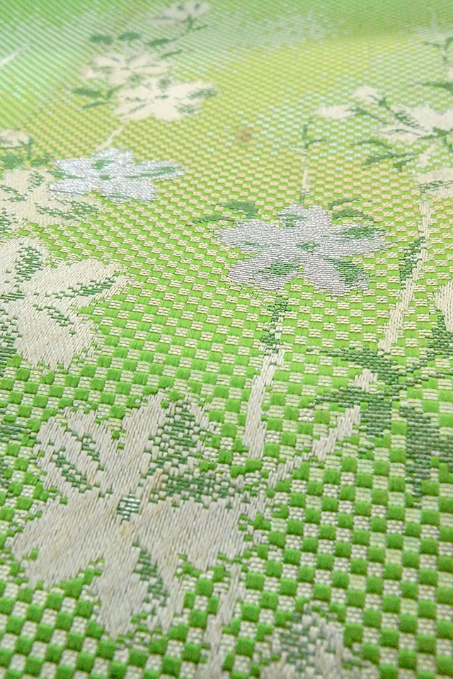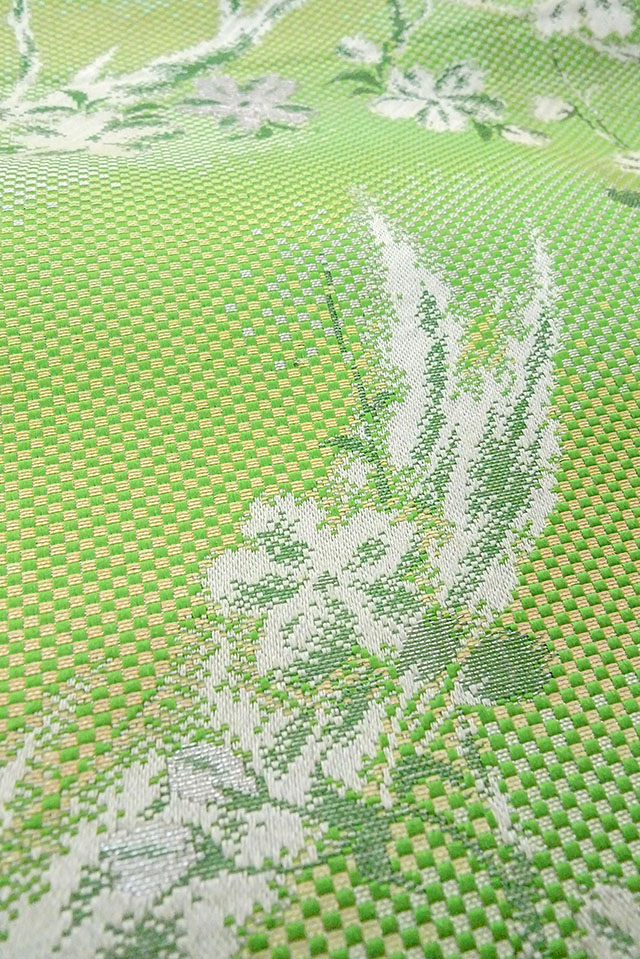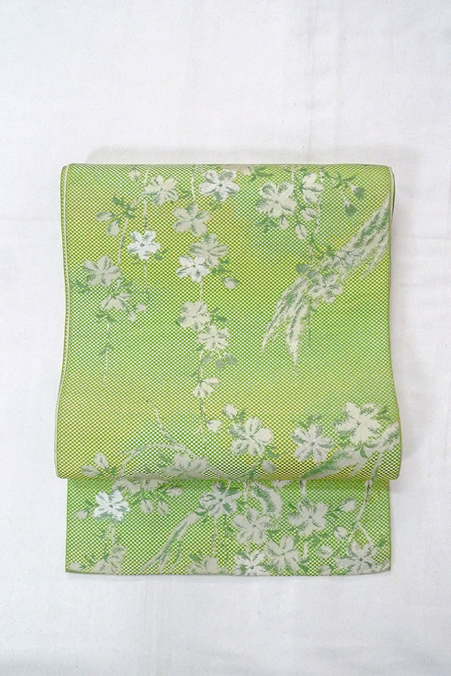 - > O0606Q Vintage Japanese Kimono Shiny Yellowish Green FUKURO NAGOYA Obi SAKURA cherry blossom Silk. (Grade C)