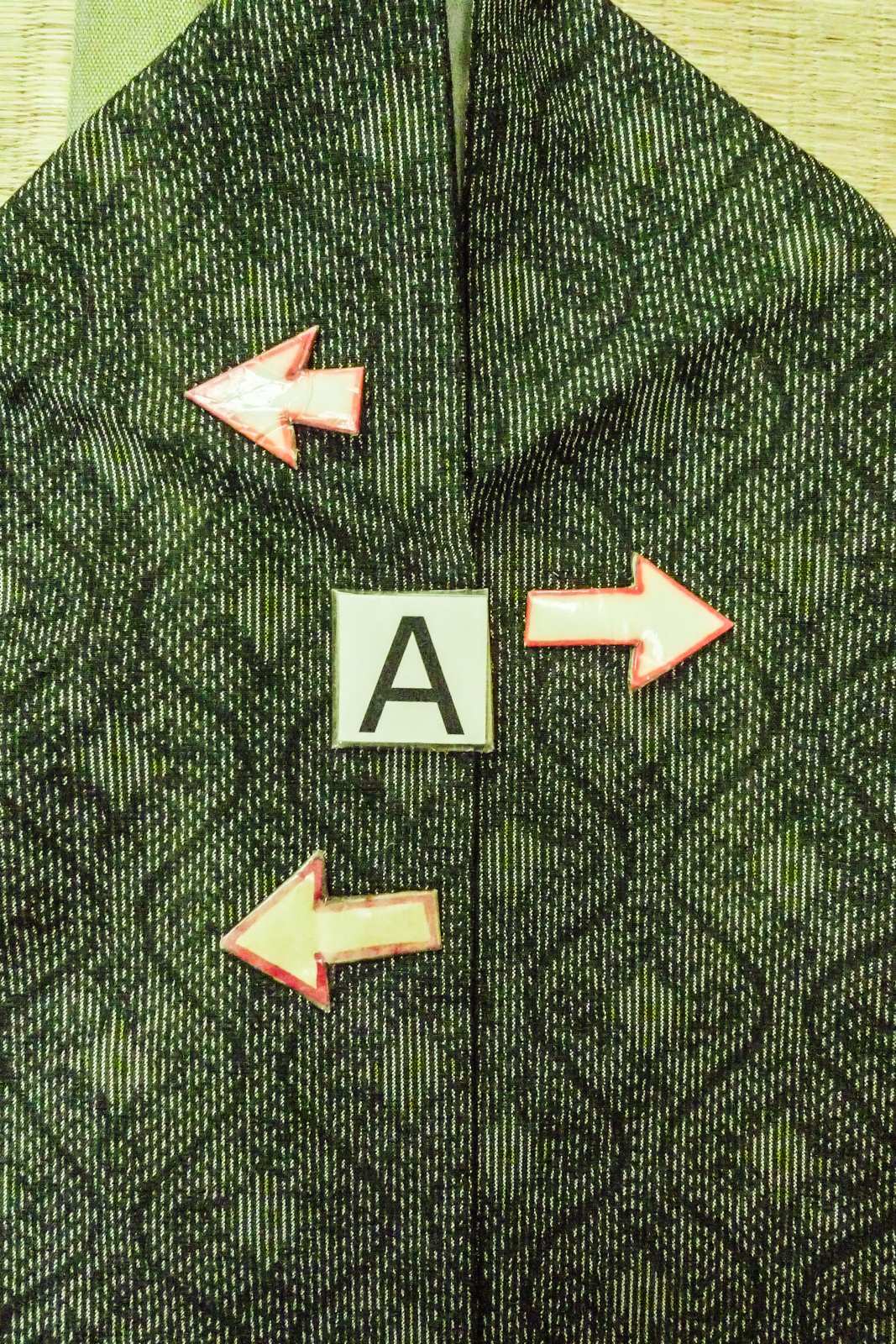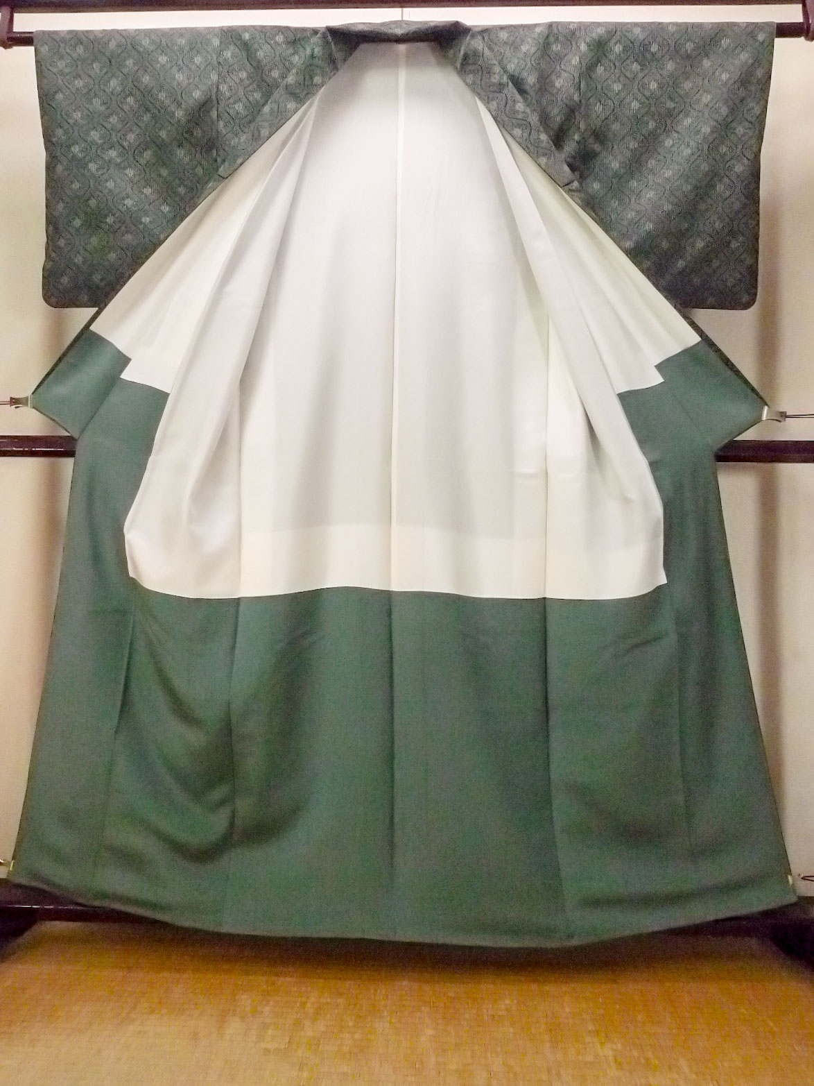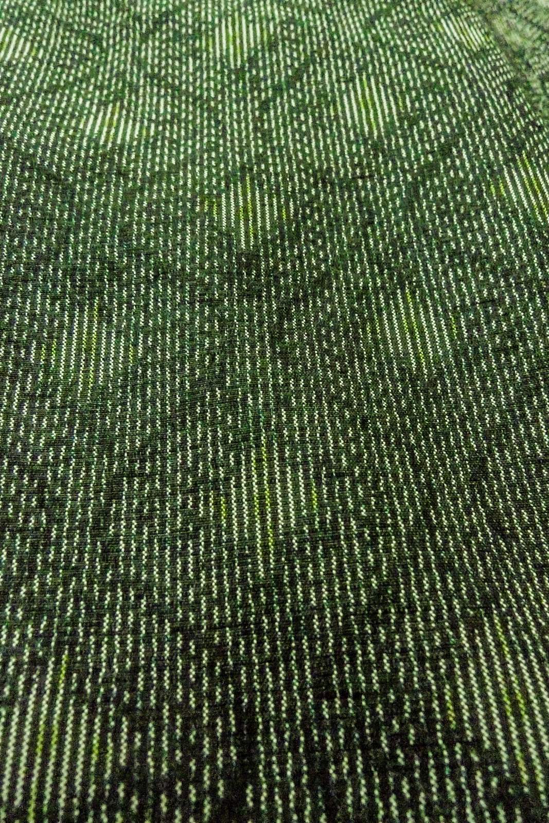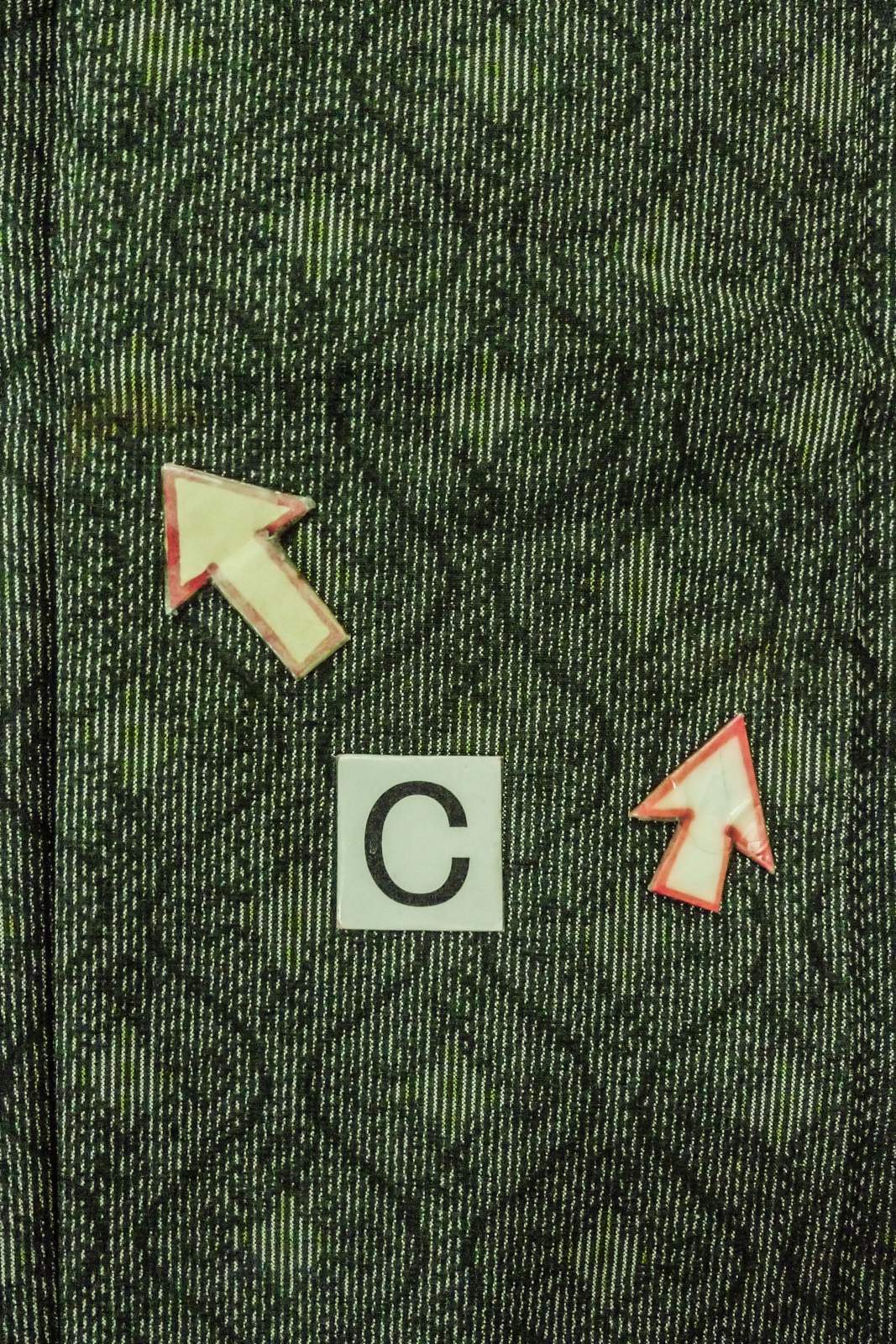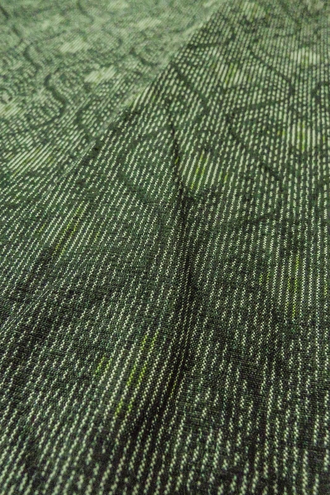 O0718A Vintage Japanese kimono Dark Green TSUMUGI pongee for women / Silk. Curved lines, (Grade B) [O0718A]