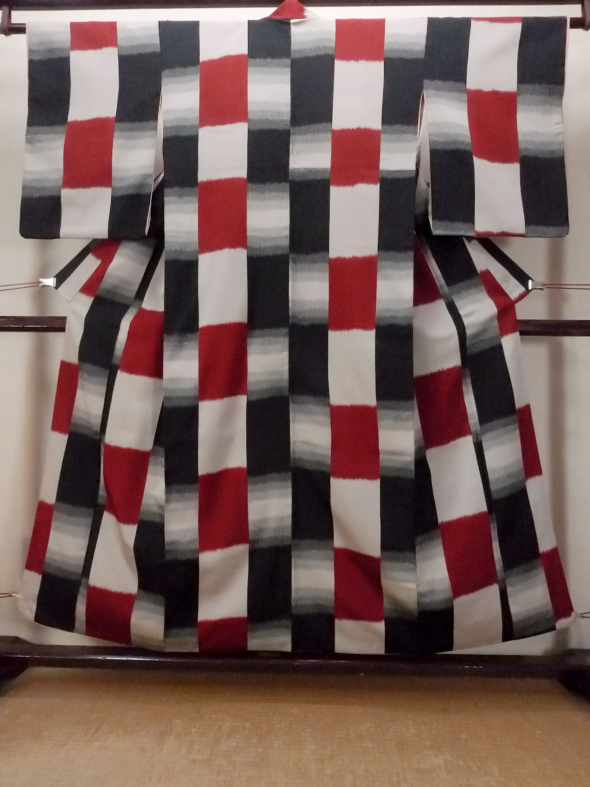 O0718E Vintage Japanese kimono Multi Color ORI woven for women / Silk. Plaid Checks (Grade C) [O0718E]