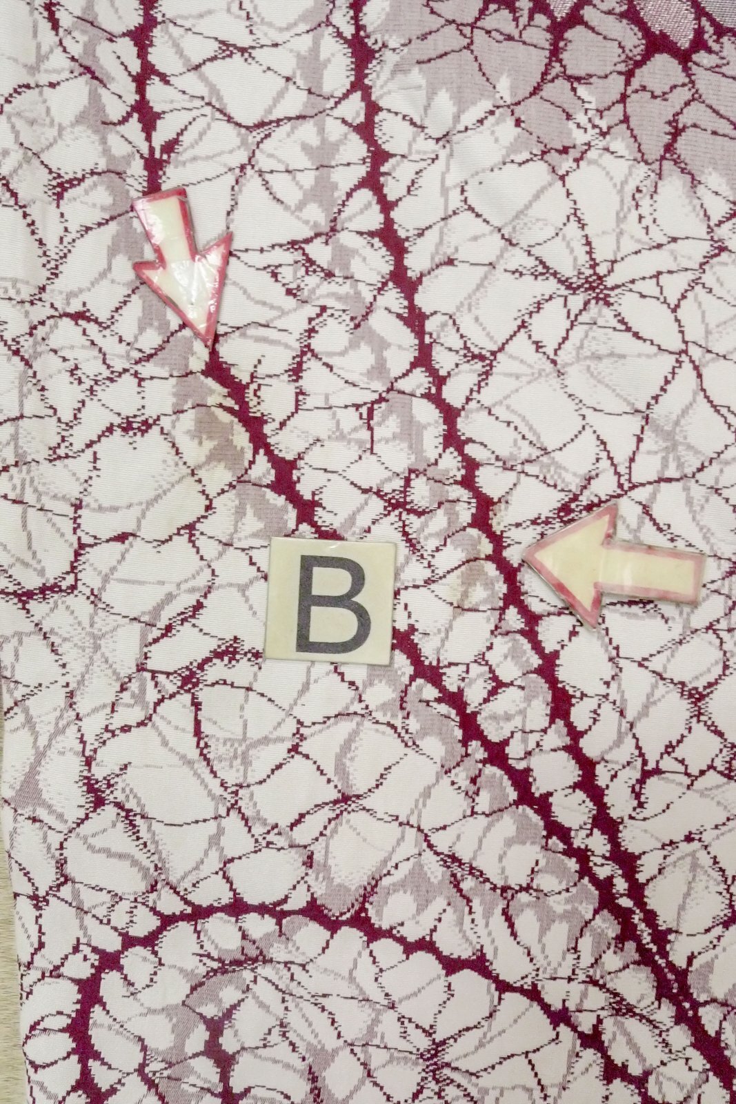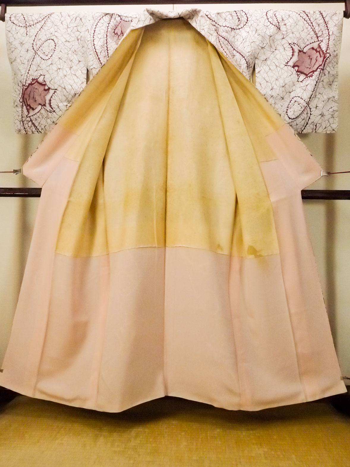 Notice :OMESHI hard Chirimen crepe.The lining has many soils, stains or turned a bit yellow.Stains/Soils all over.