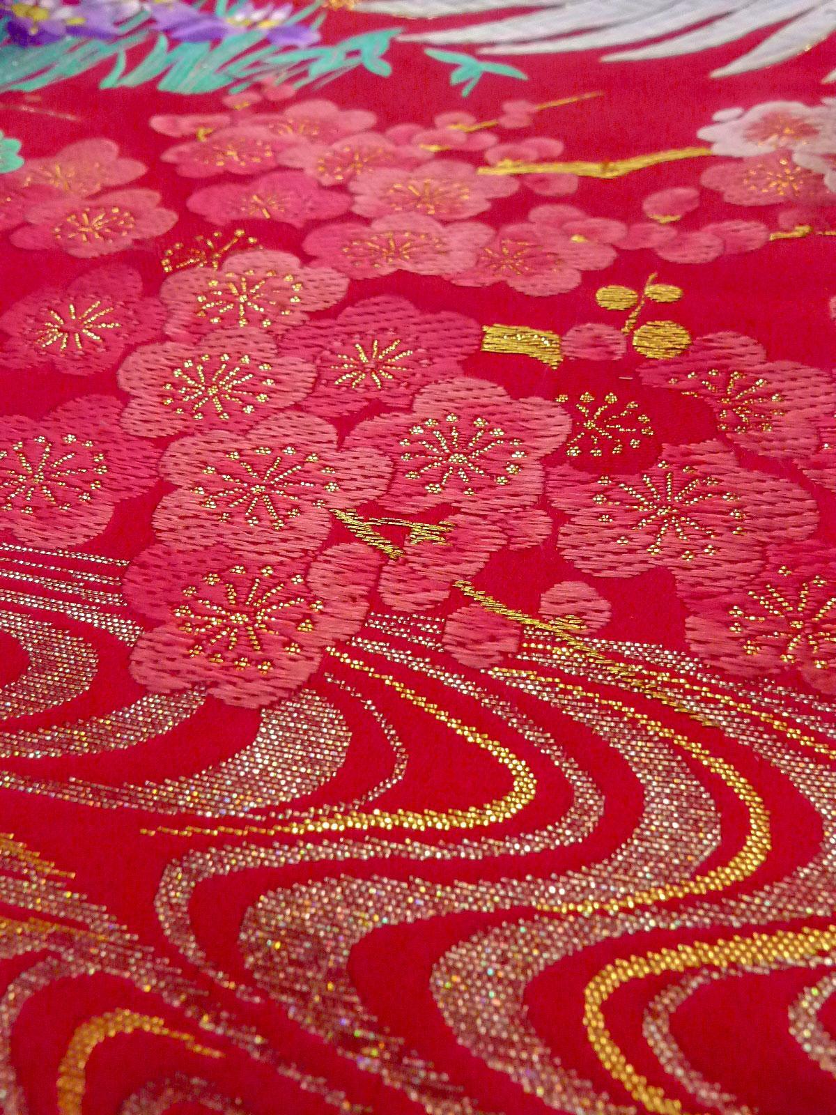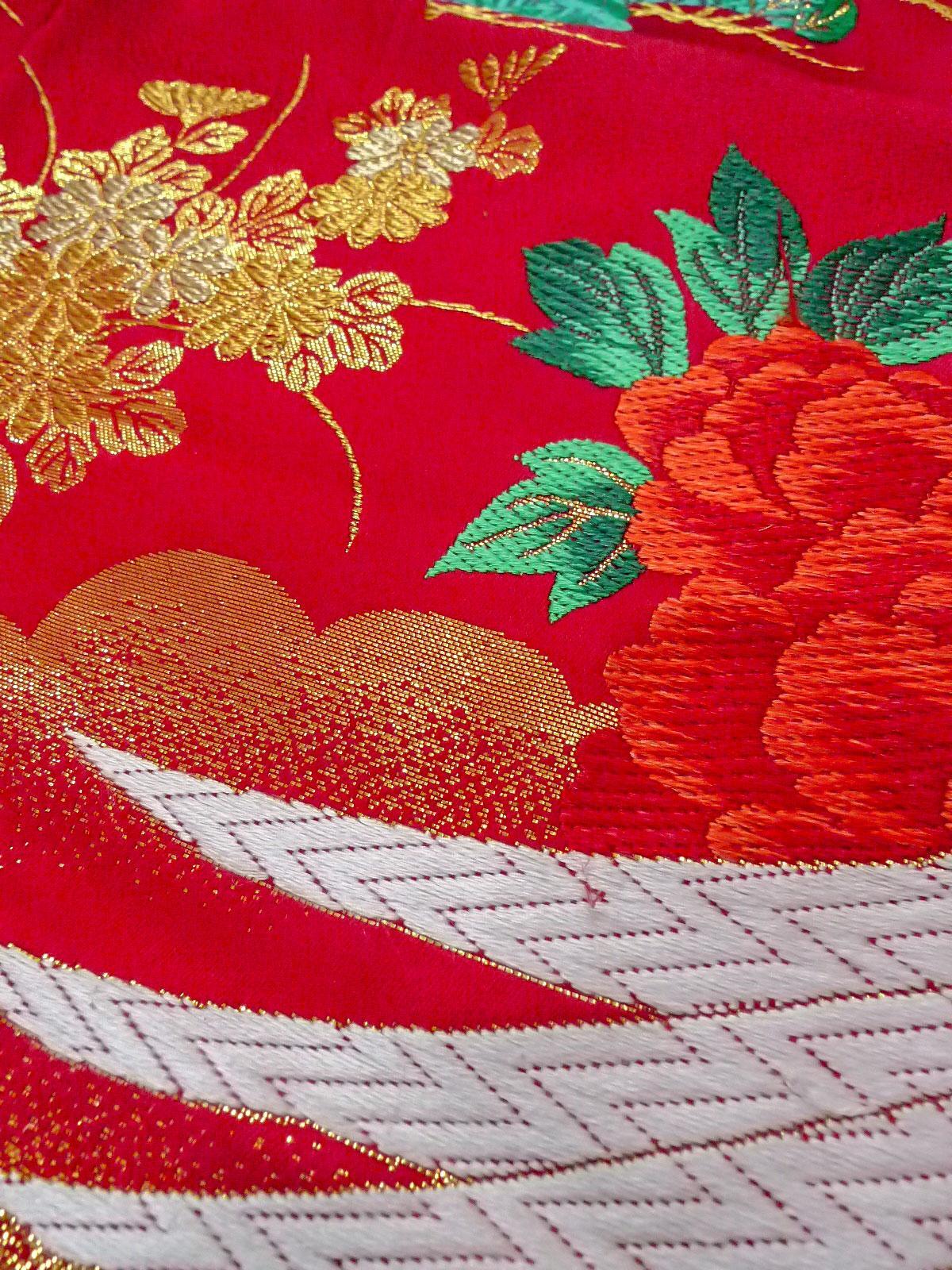N1015Q Used Japanese kimono Vivid Red UCHIKAKE Wedding for women / Silk. Peony, (Grade B)
