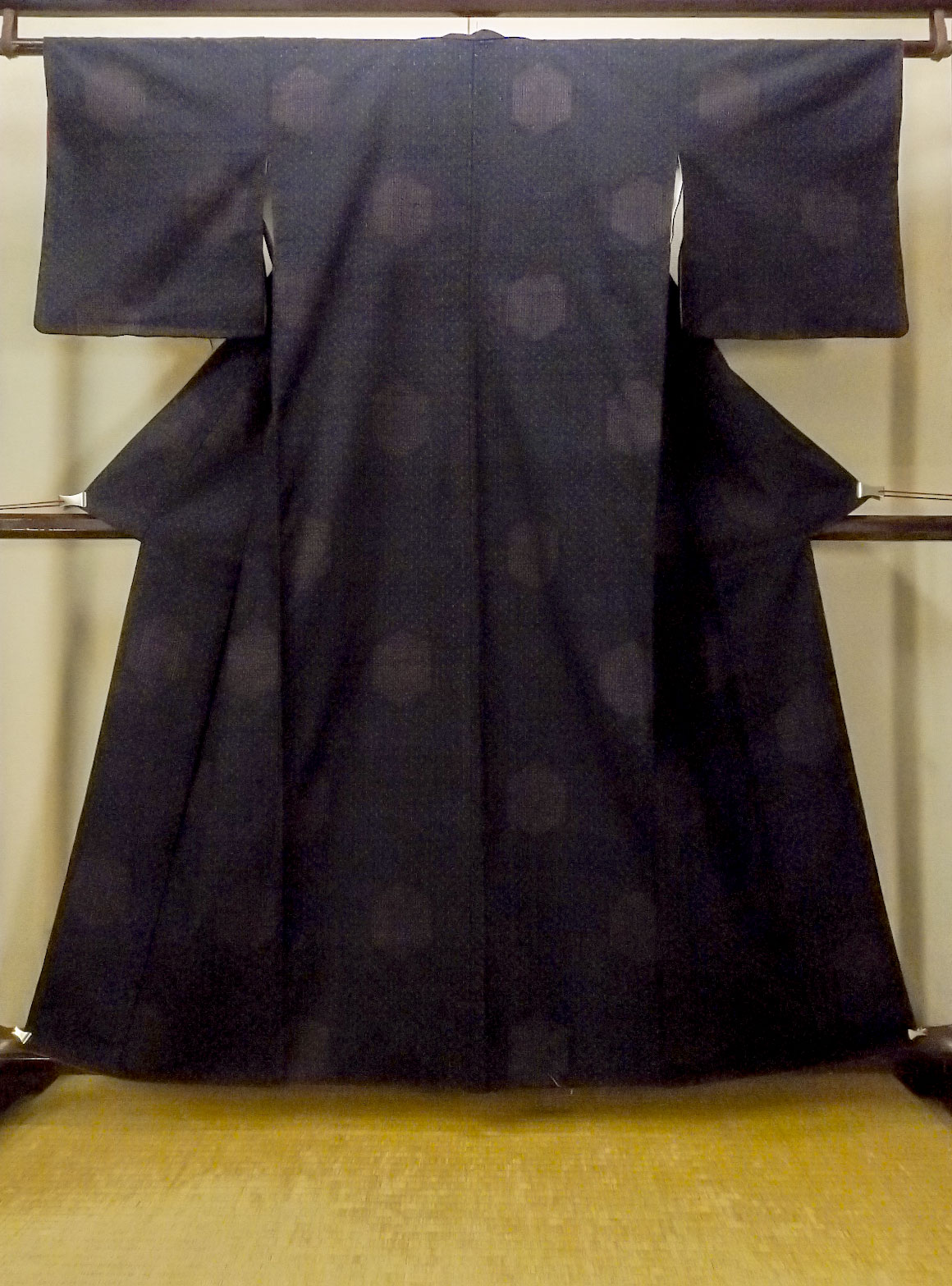 Mint O0711H Used Japanese kimono Black ISHIGE-YUKI-TSUMUGI for women / Silk. Tortoise-shell pattern(Hexagonal pattern), (Grade A)