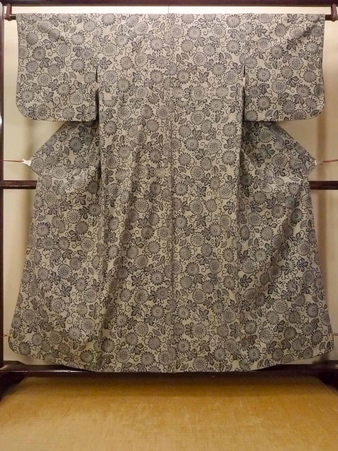 O0711N Used Japanese kimono Gray TSUMUGI pongee for women / Silk. Chinese flower, (Grade B)