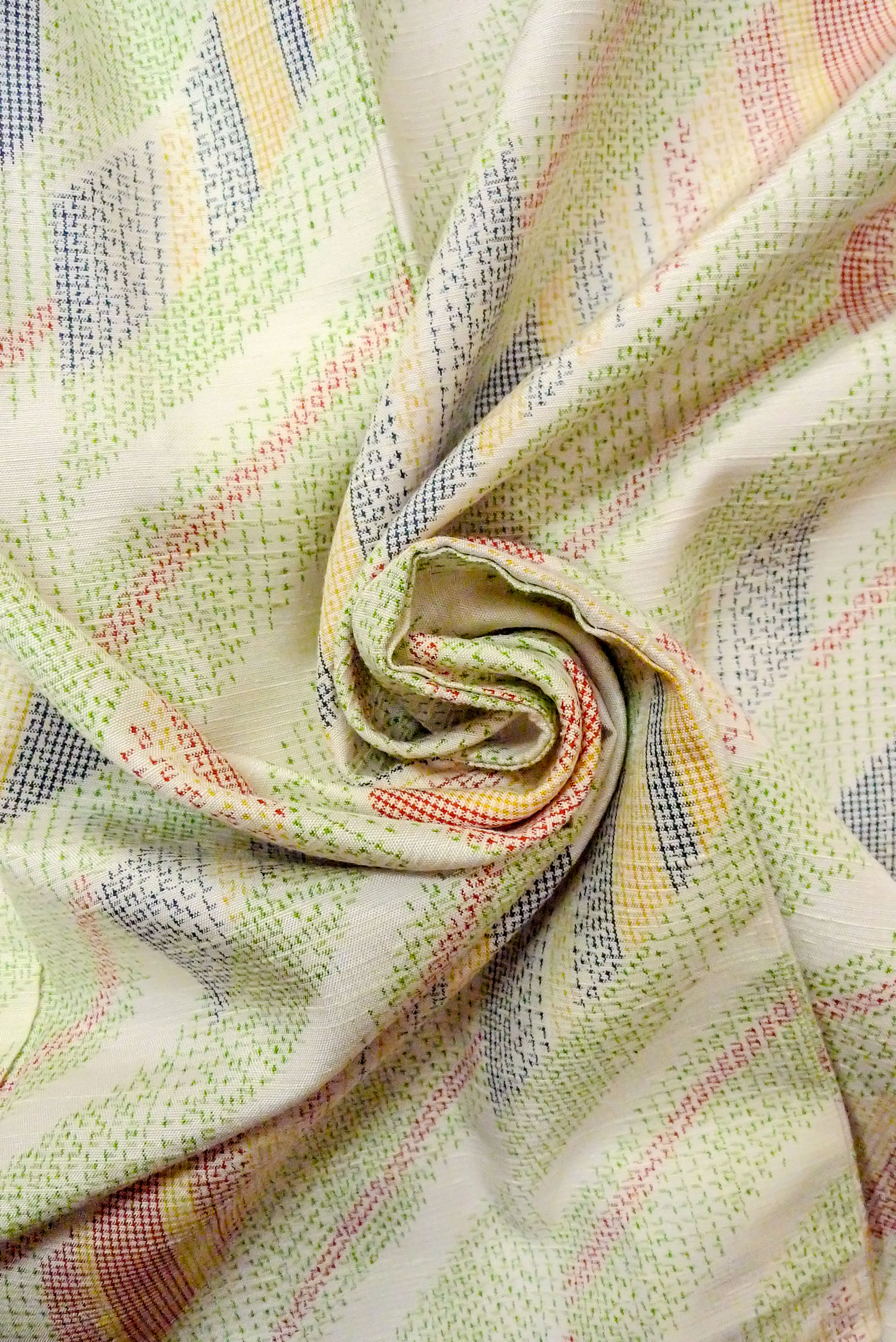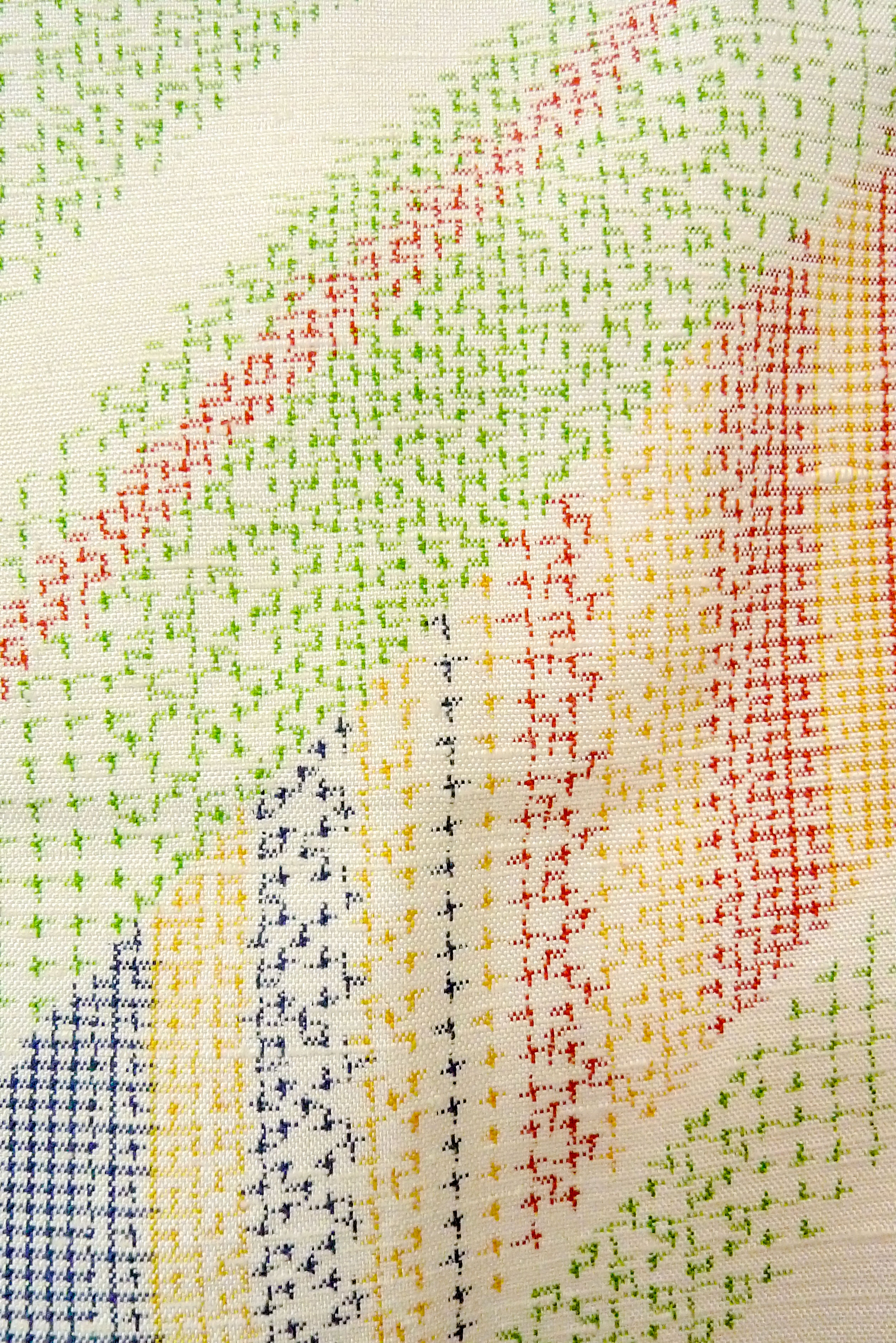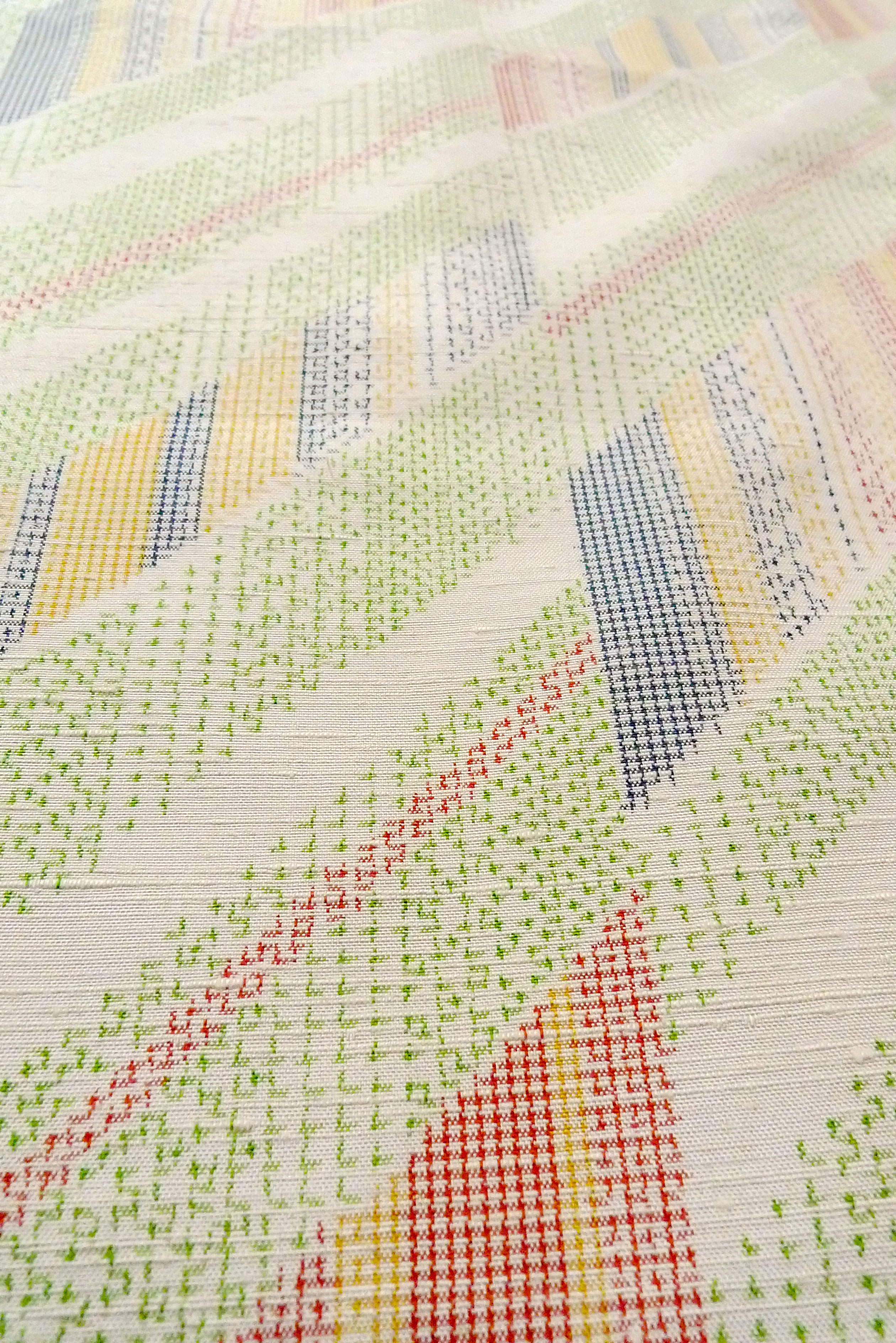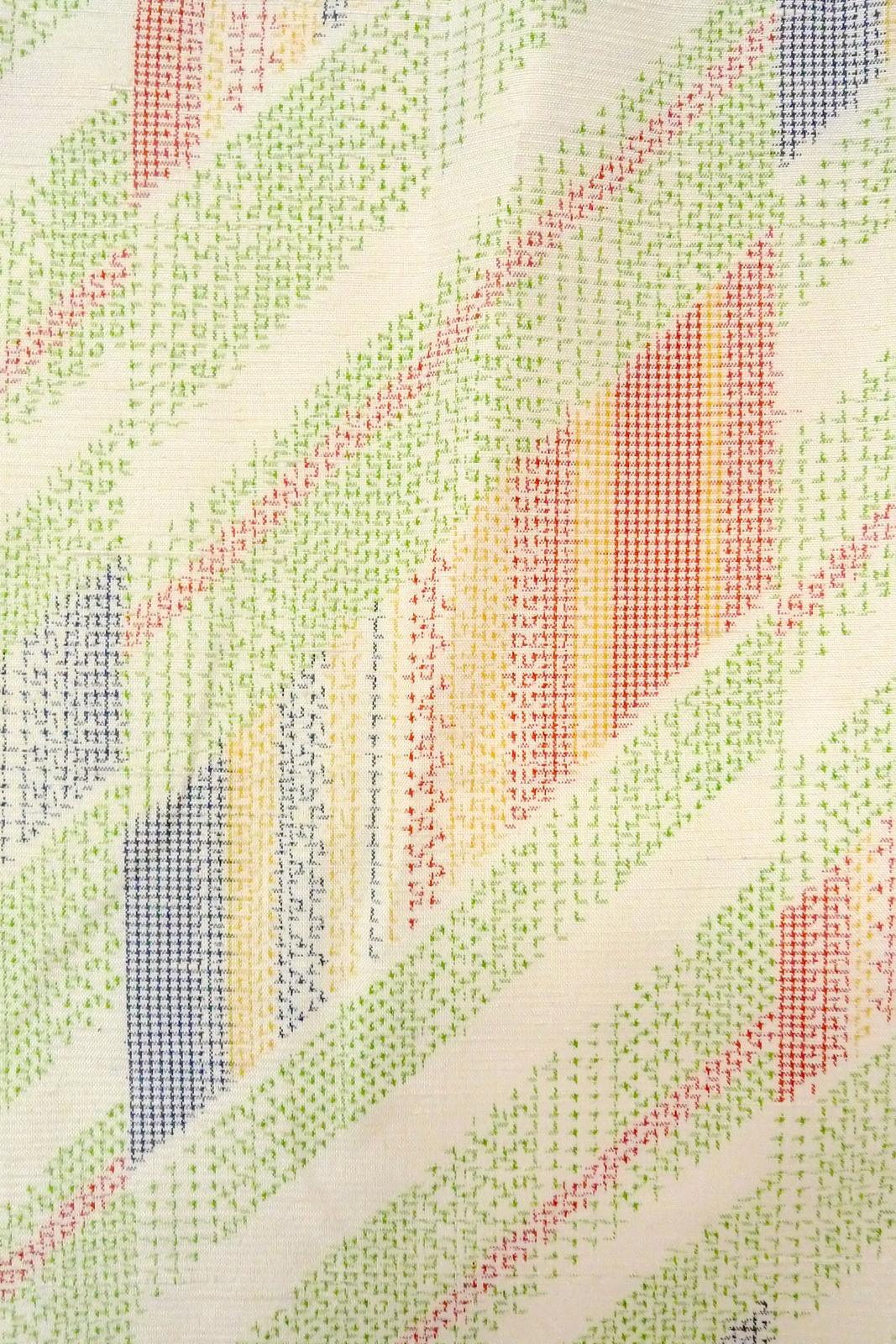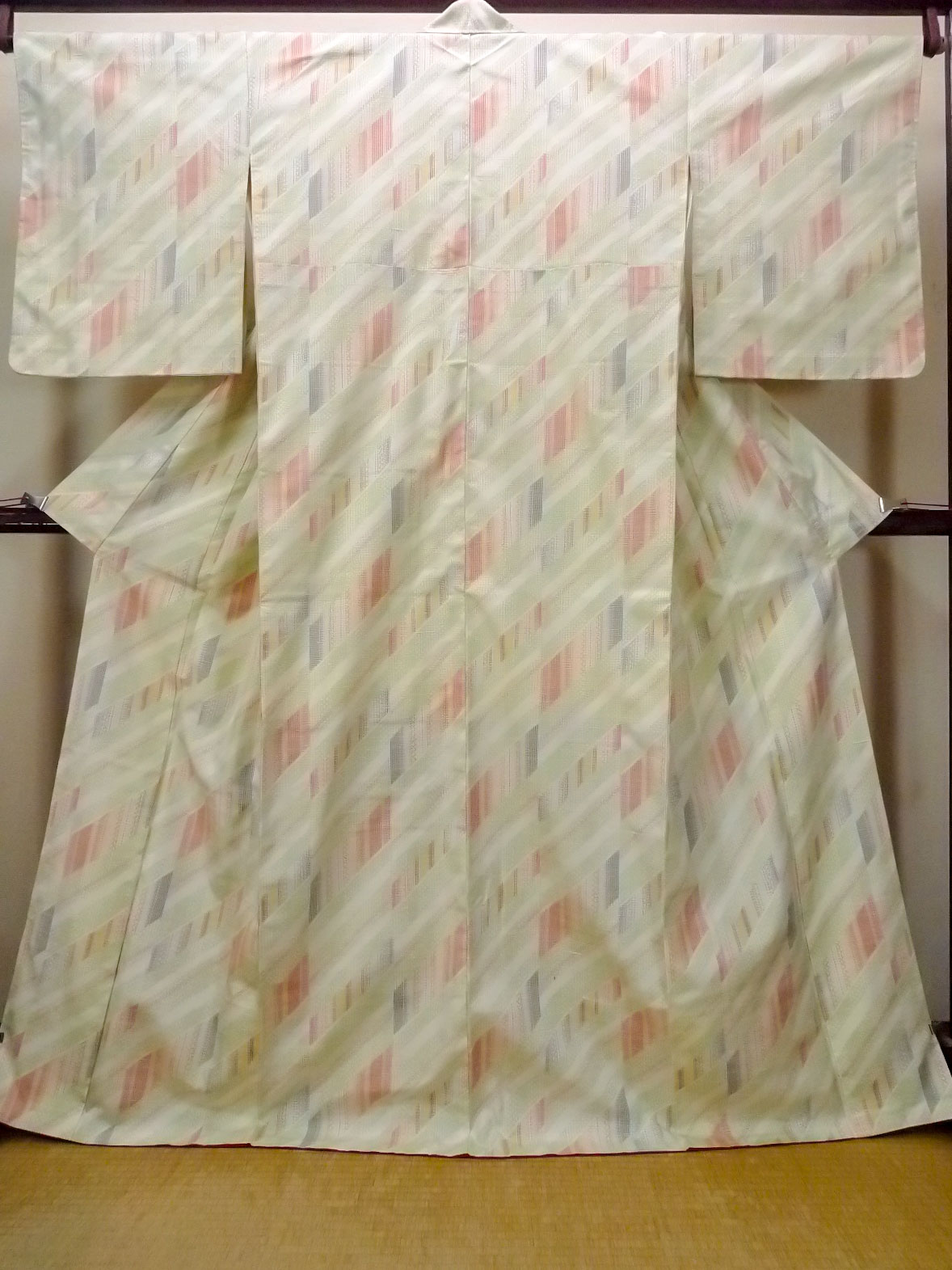 O0711Z Used Japanese kimono Pale Multi Color TSUMUGI pongee for women / Silk. Geometrical pattern (Grade B)