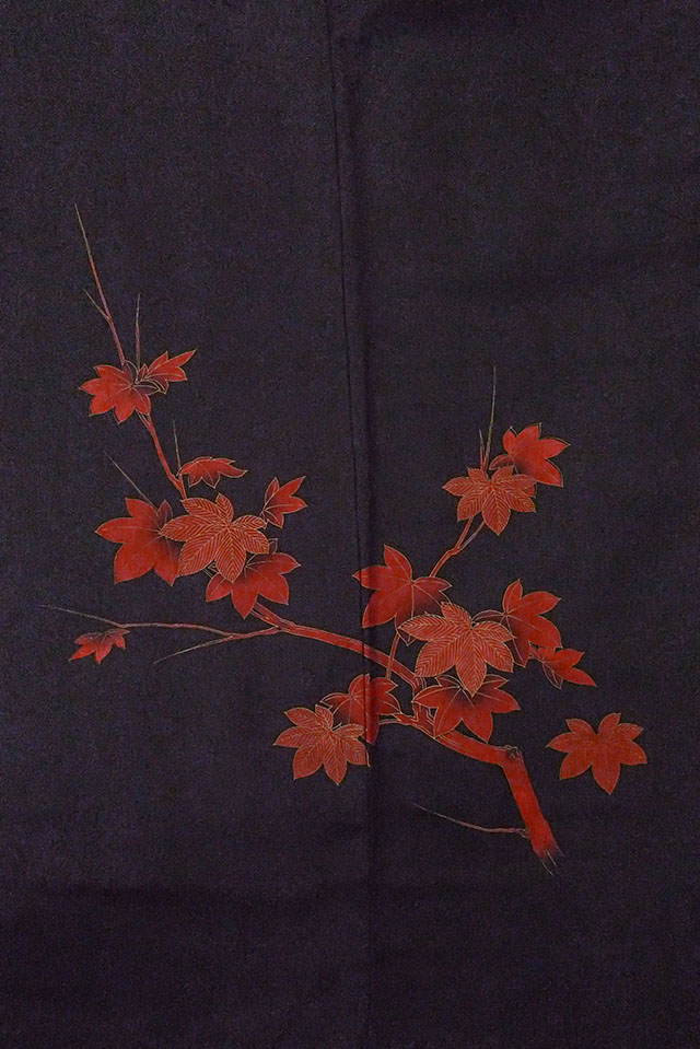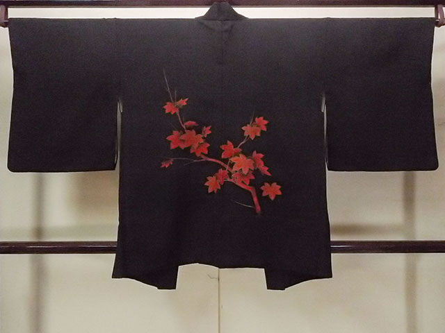 O0902B Vintage Japanese kimono Black HAORI short jacket for women / Silk. MOMIJI maple leaf (Grade B)