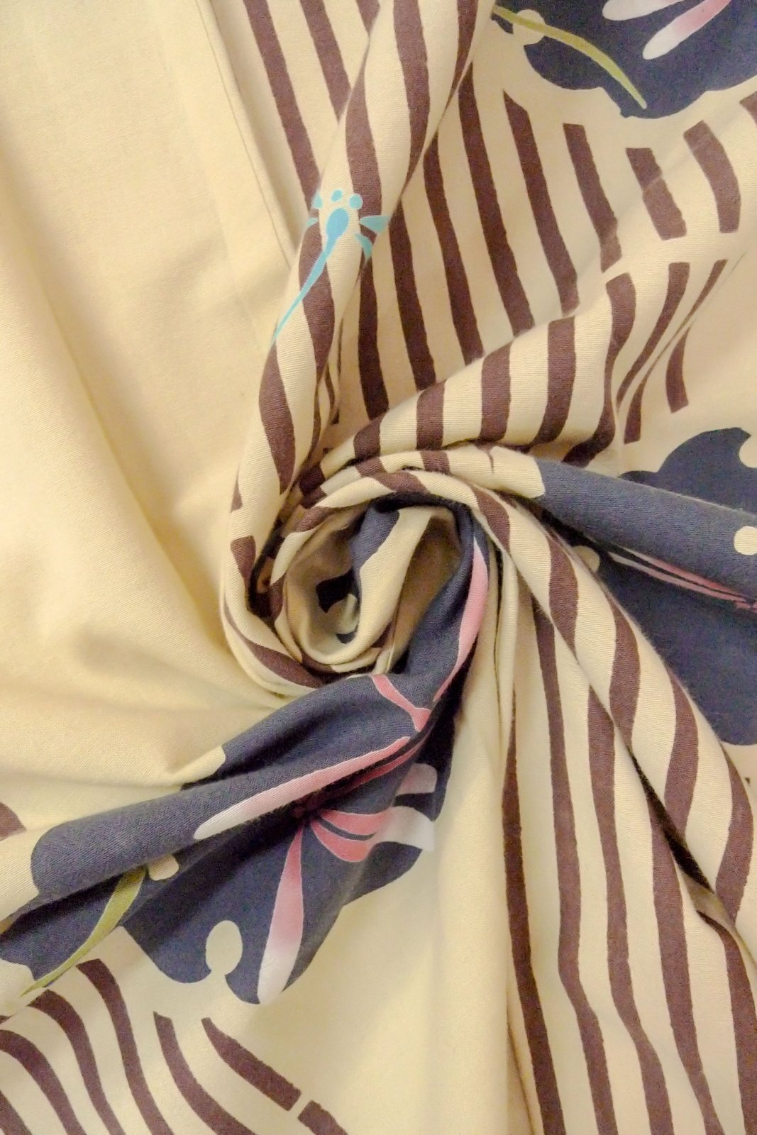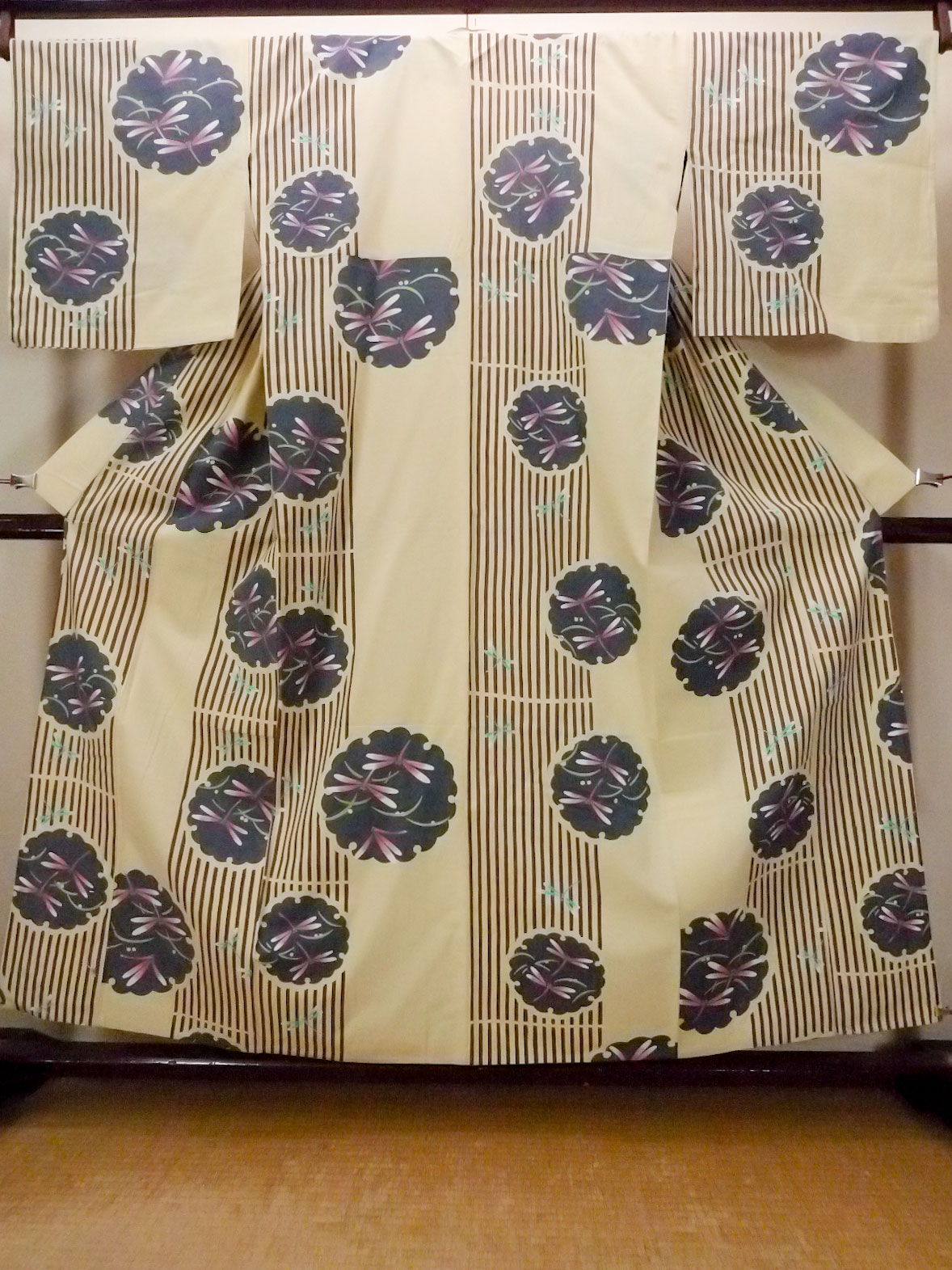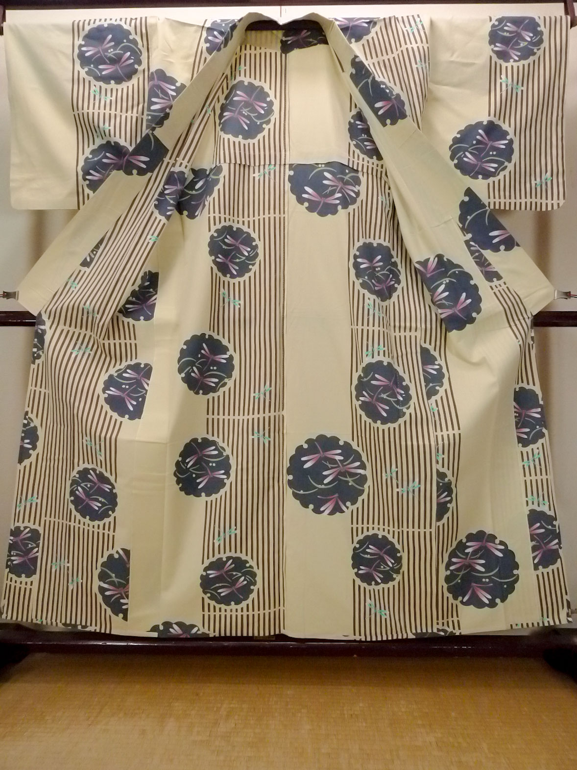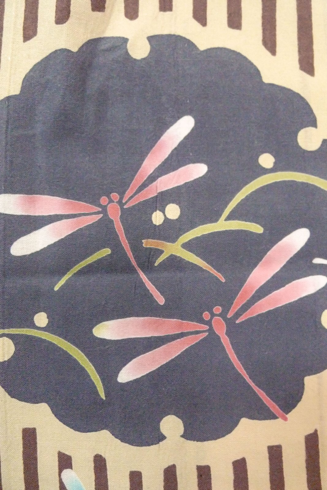 - > O0826K Used Japanese kimono Beige Pour Dyed Yukata for women / Cotton. Stripes, Dragonfly pattern (Grade B)