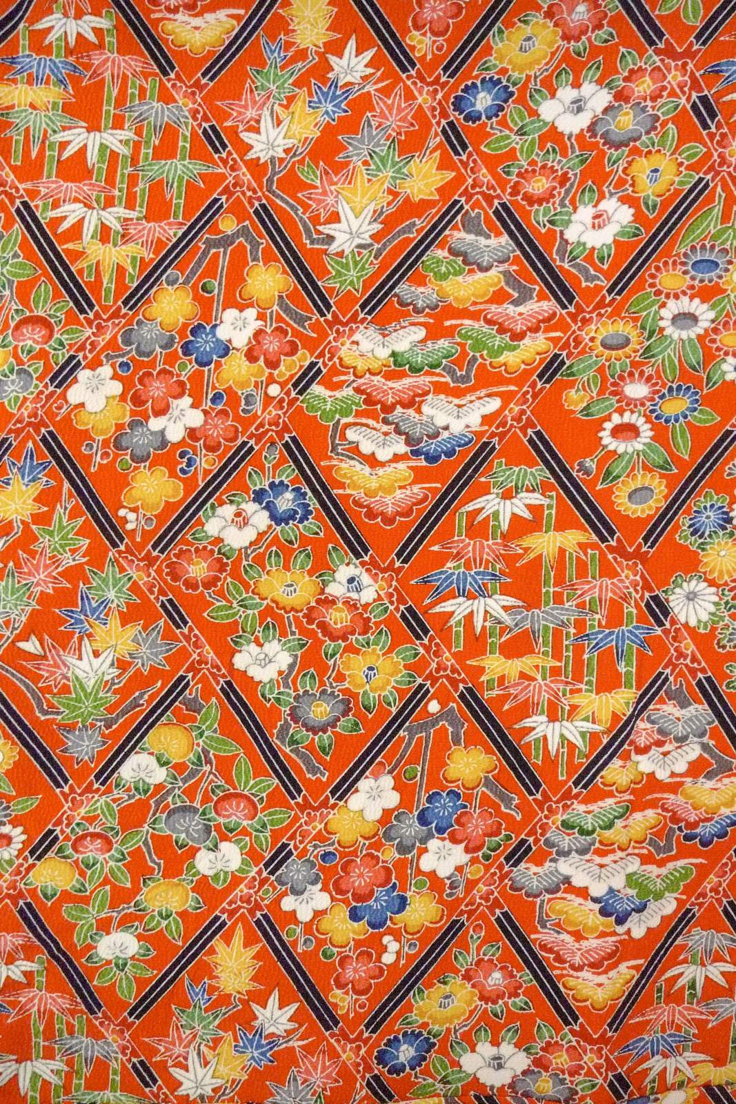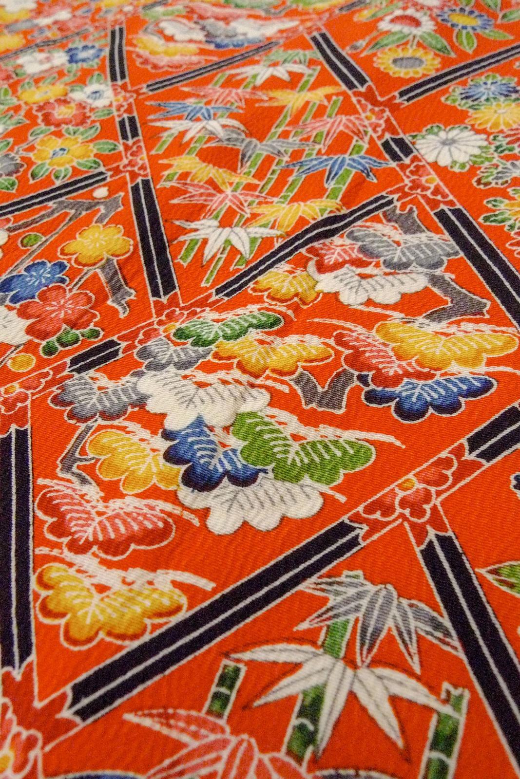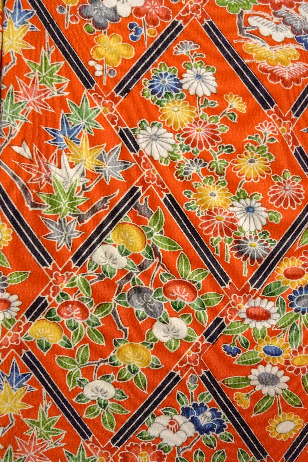 Mint O0826V Vintage Japanese kimono Vivid Orange KOMON dyed for women / Silk. Peony, (Grade A) [O0826V]