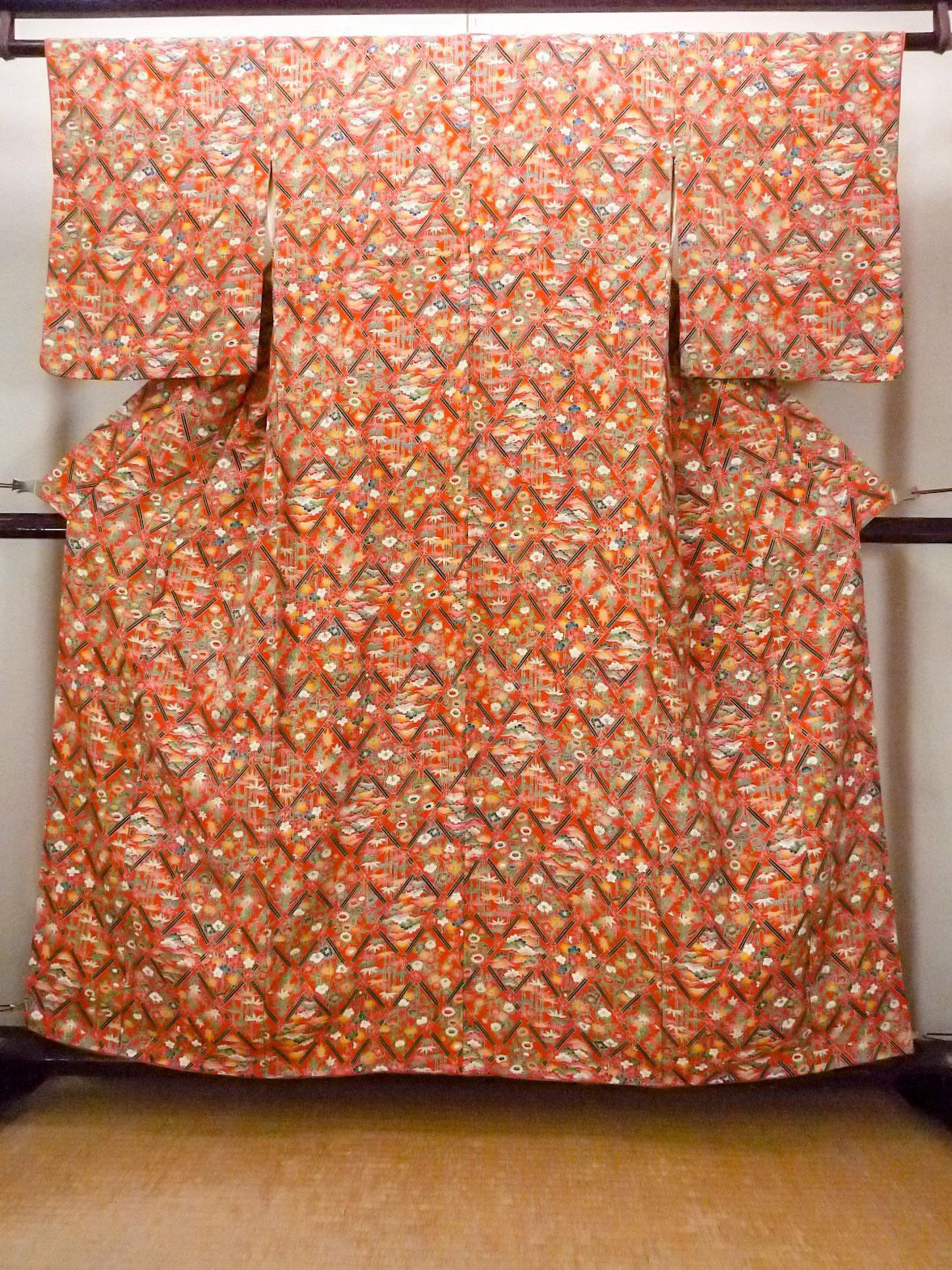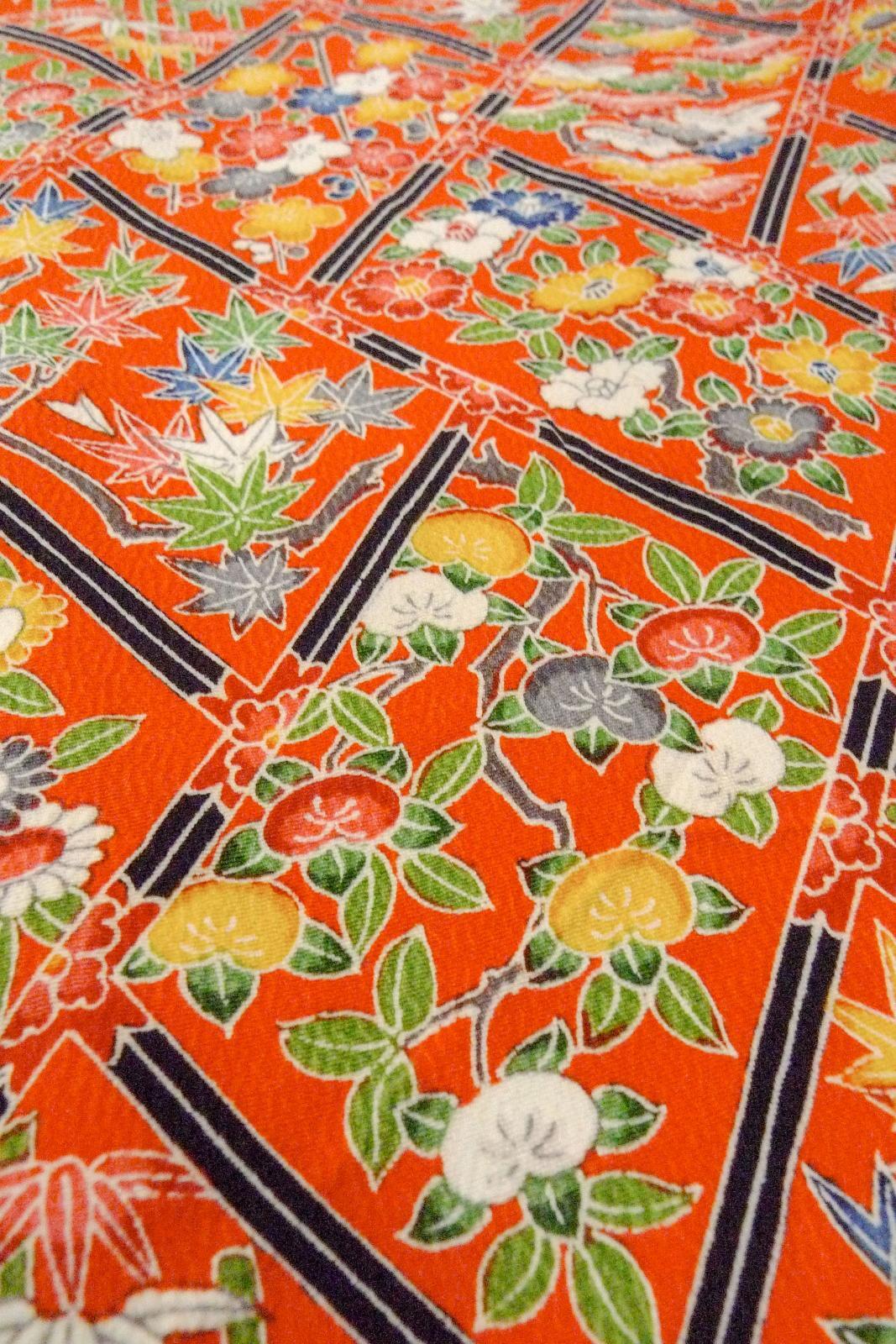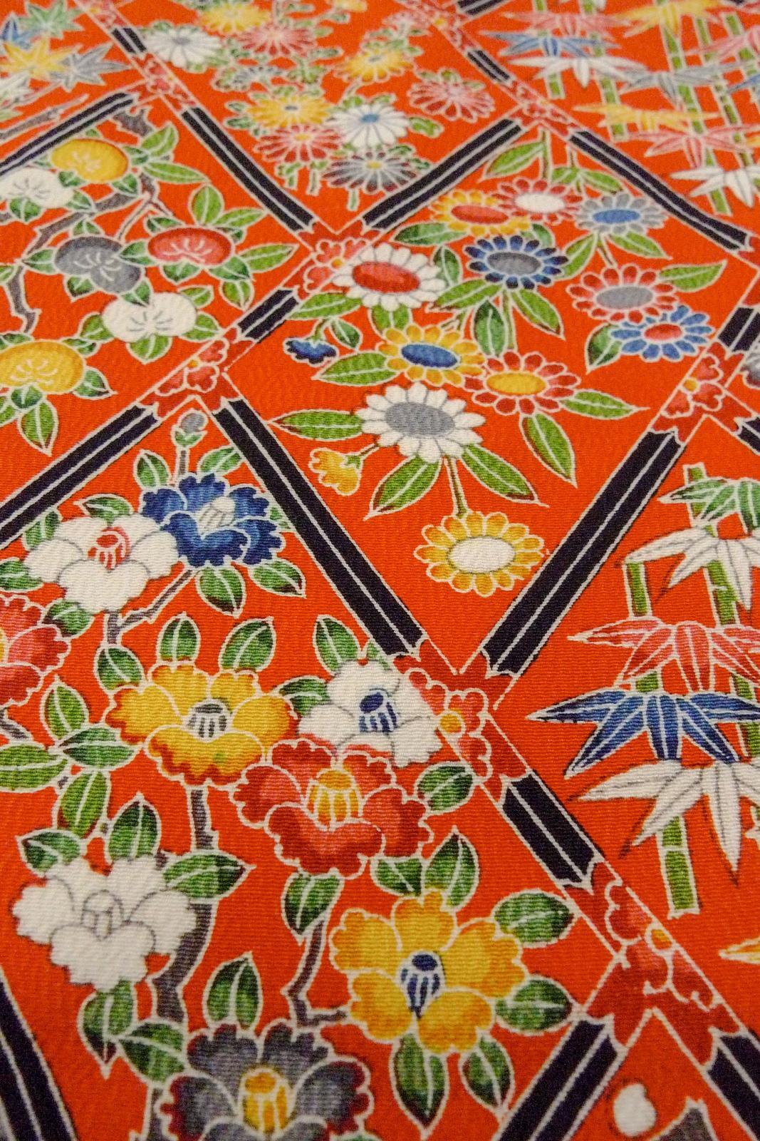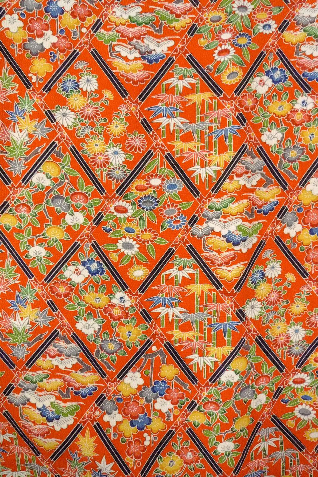 Mint O0826V Vintage Japanese kimono Vivid Orange KOMON dyed for women / Silk. Peony, (Grade A) [O0826V]