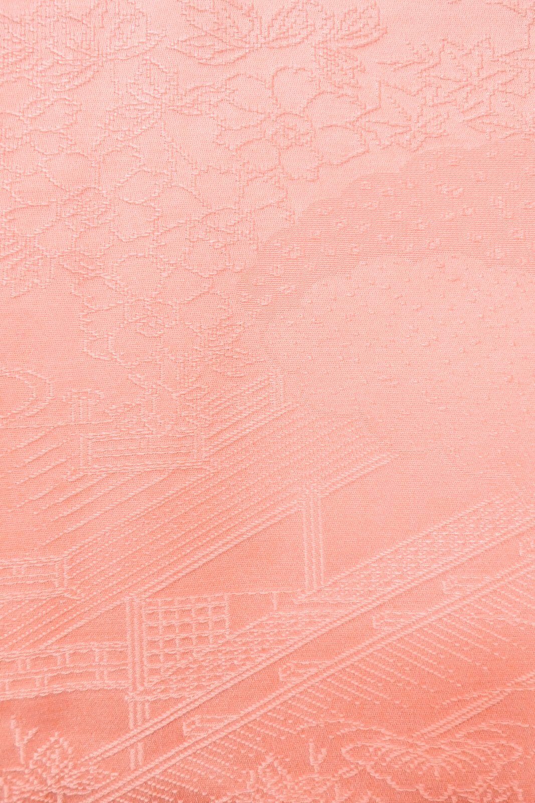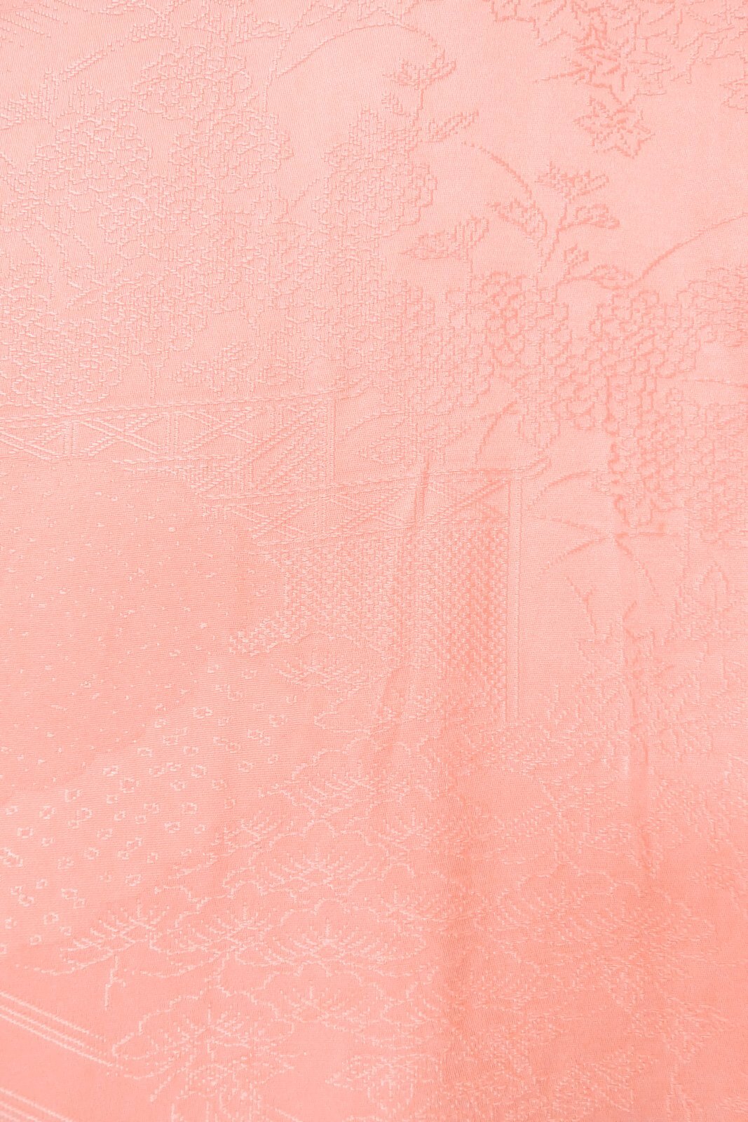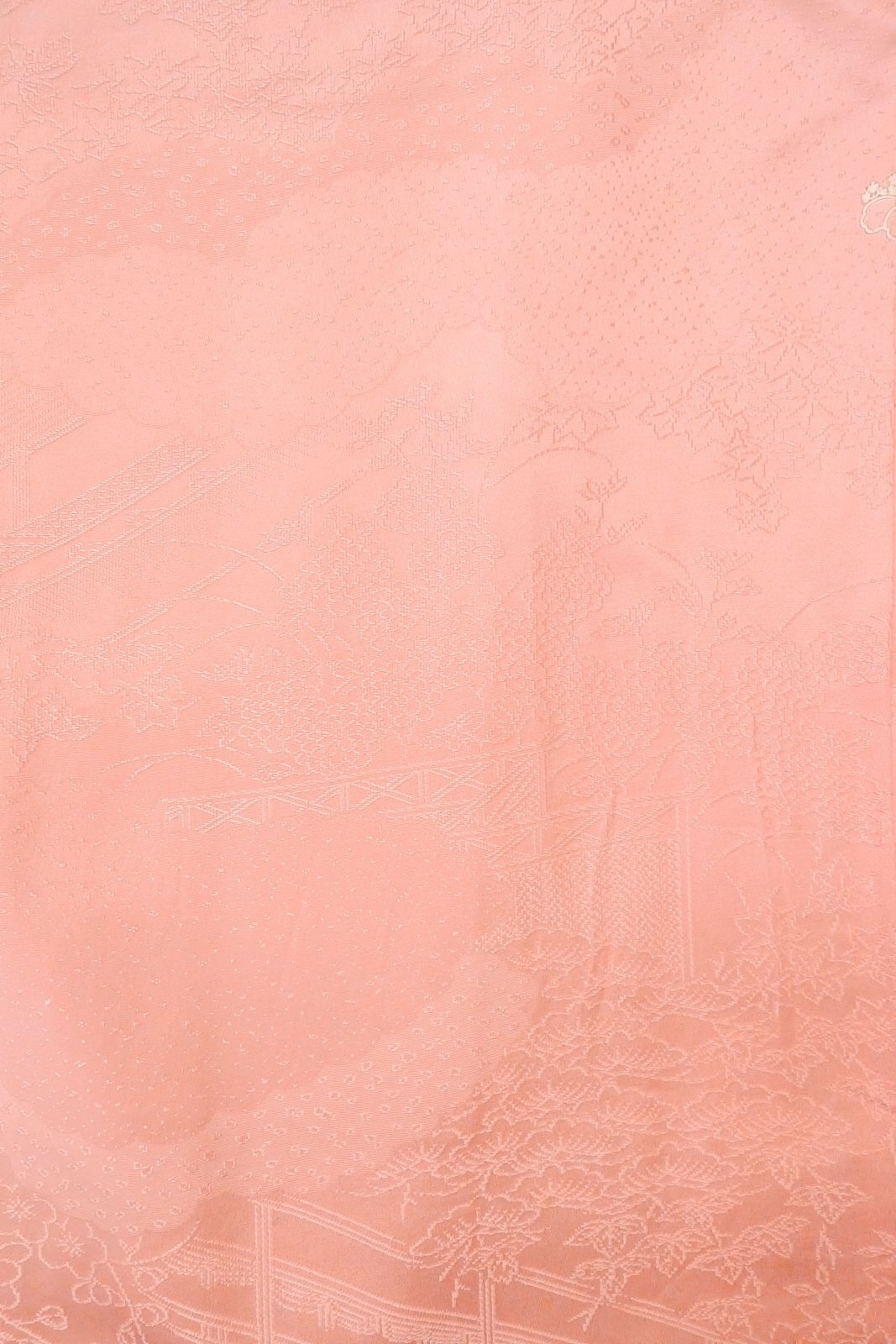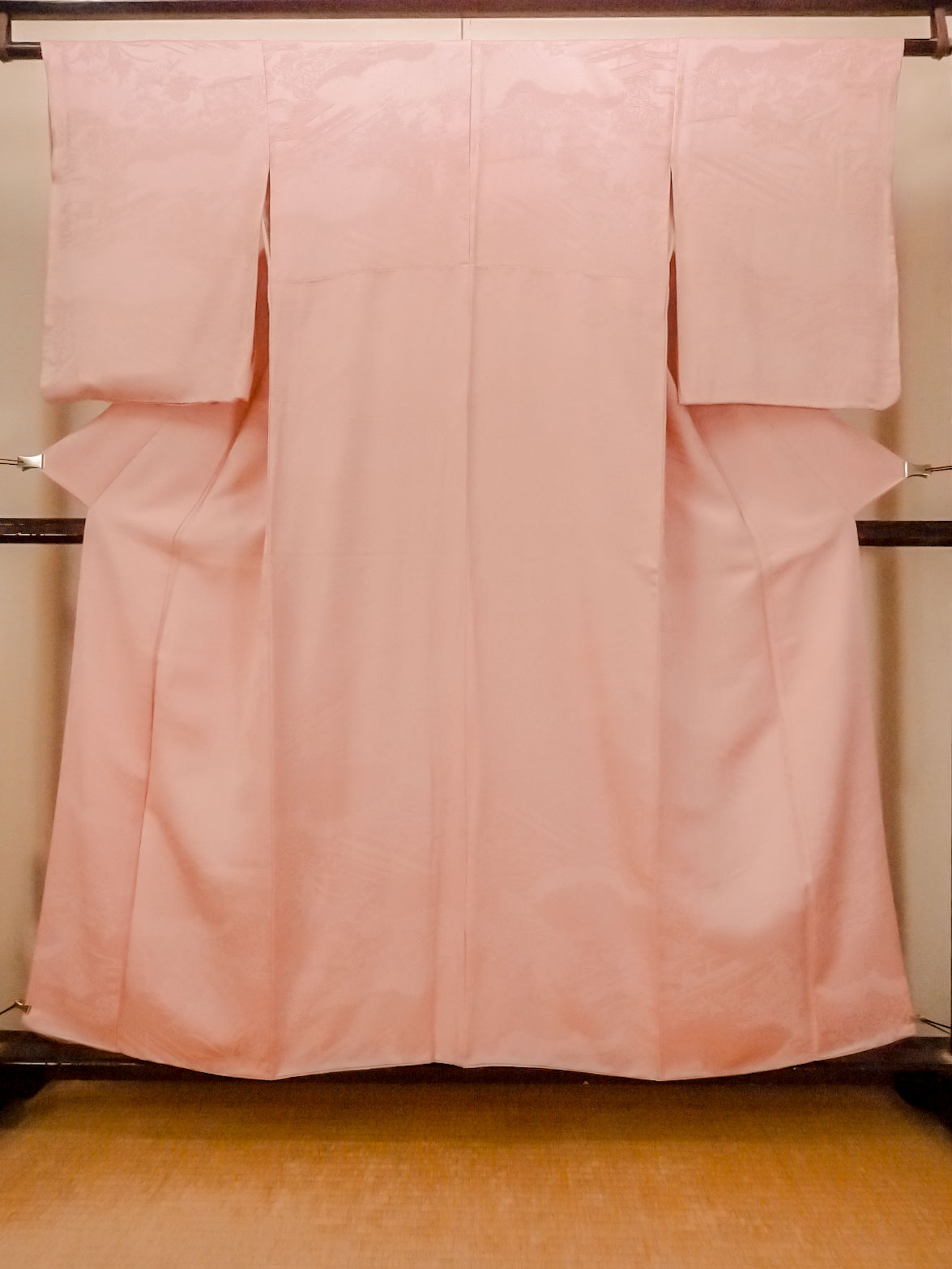 O1002Q Vintage Japanese kimono Shiny Pink IROMUJI plain colored for women / Silk., Base woven pattern: Pine tree/branch/needle, House, Stream, Gap in a cloud, Folding fan pattern (Grade B)