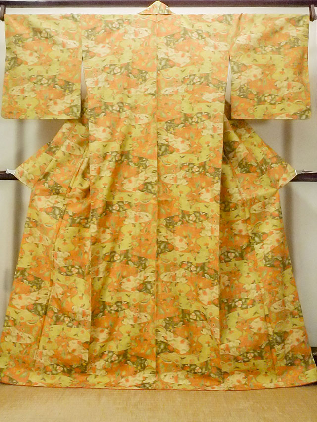 O1209P Vintage Japanese kimono Orange OJIYATSUMUGI for women / Silk. Flower (Grade A) [O1209P]