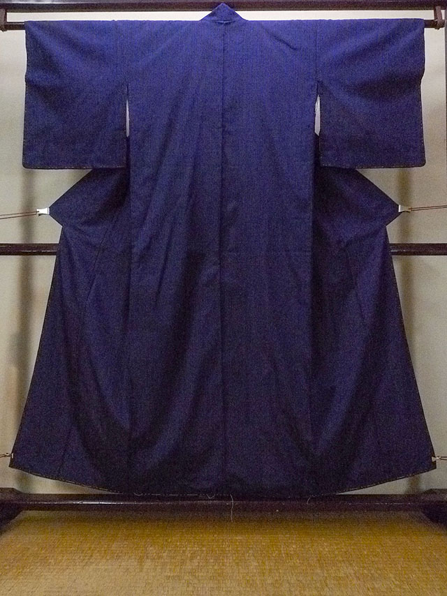 O1209S Vintage Japanese kimono Dark Blue TSUMUGI pongee for women / Silk. Stripes (Grade A)