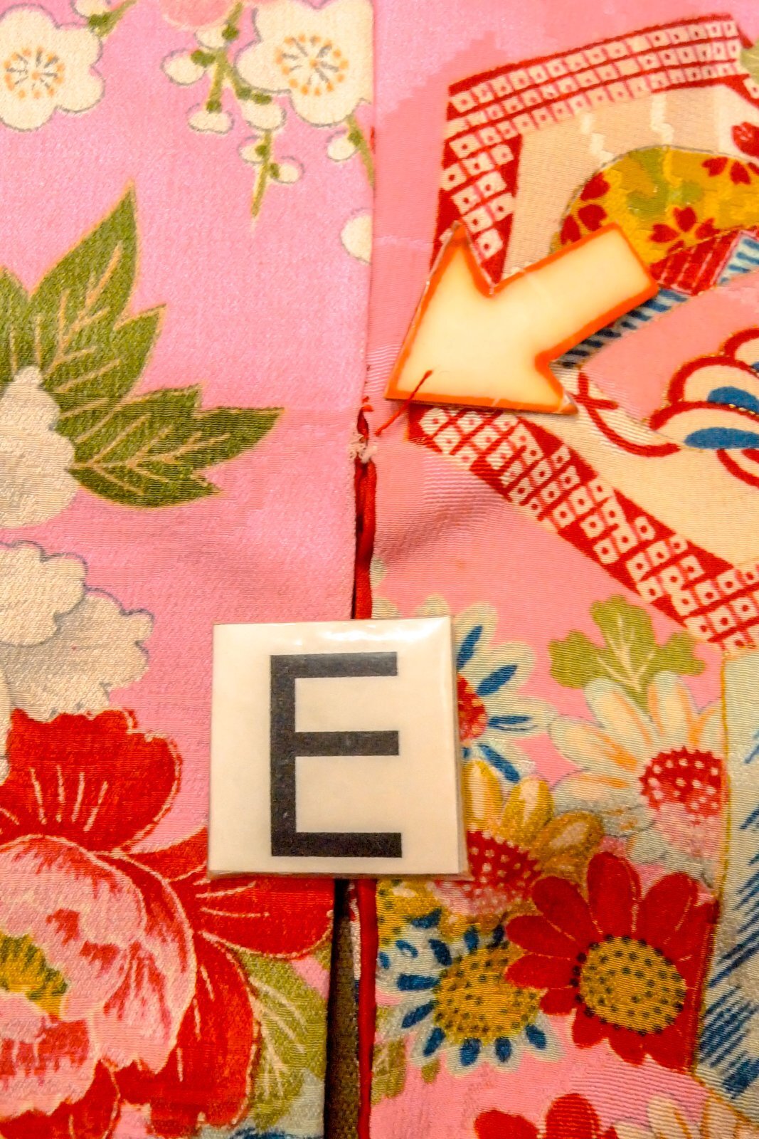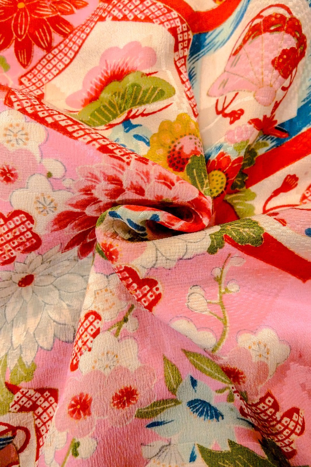 O1225B Antique Japanese kimono Shiny Pink Kimono for Girls for women / Silk. Peony, The thread is partially loose. (Grade C)