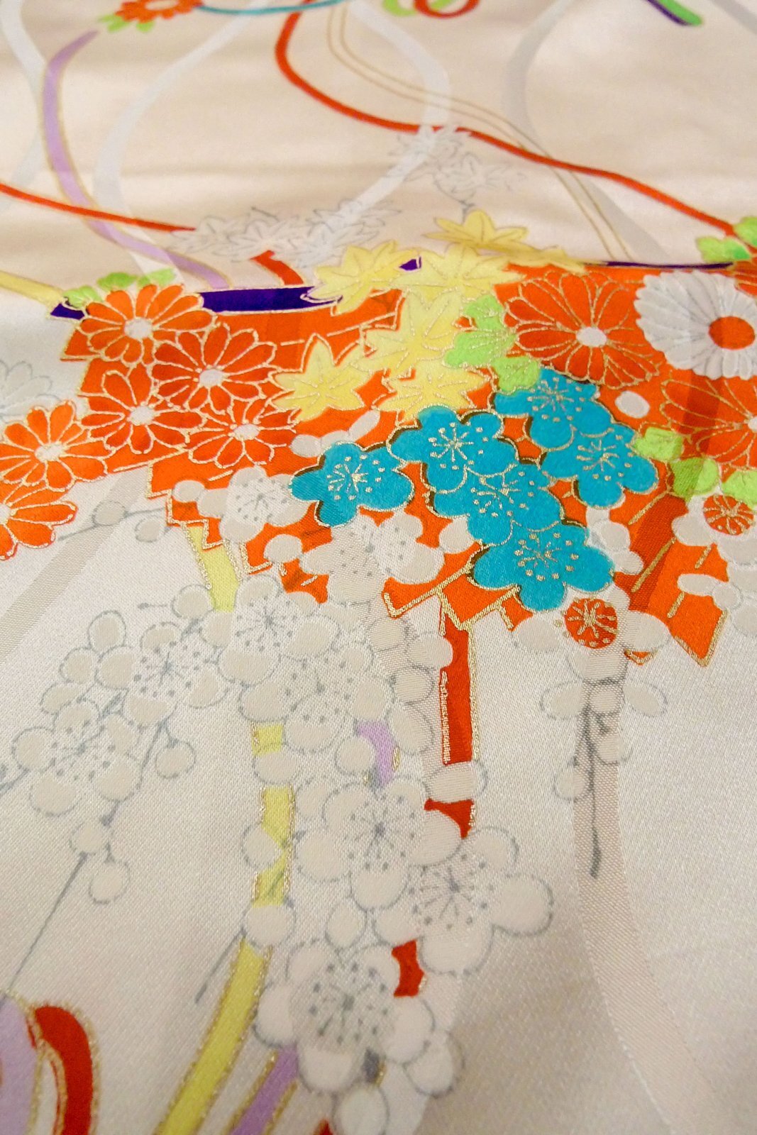 O1225V Vintage Japanese kimono Shiny White Kimono for Girls for women / Silk. Chrysanthemum (Grade B) [O1225V]