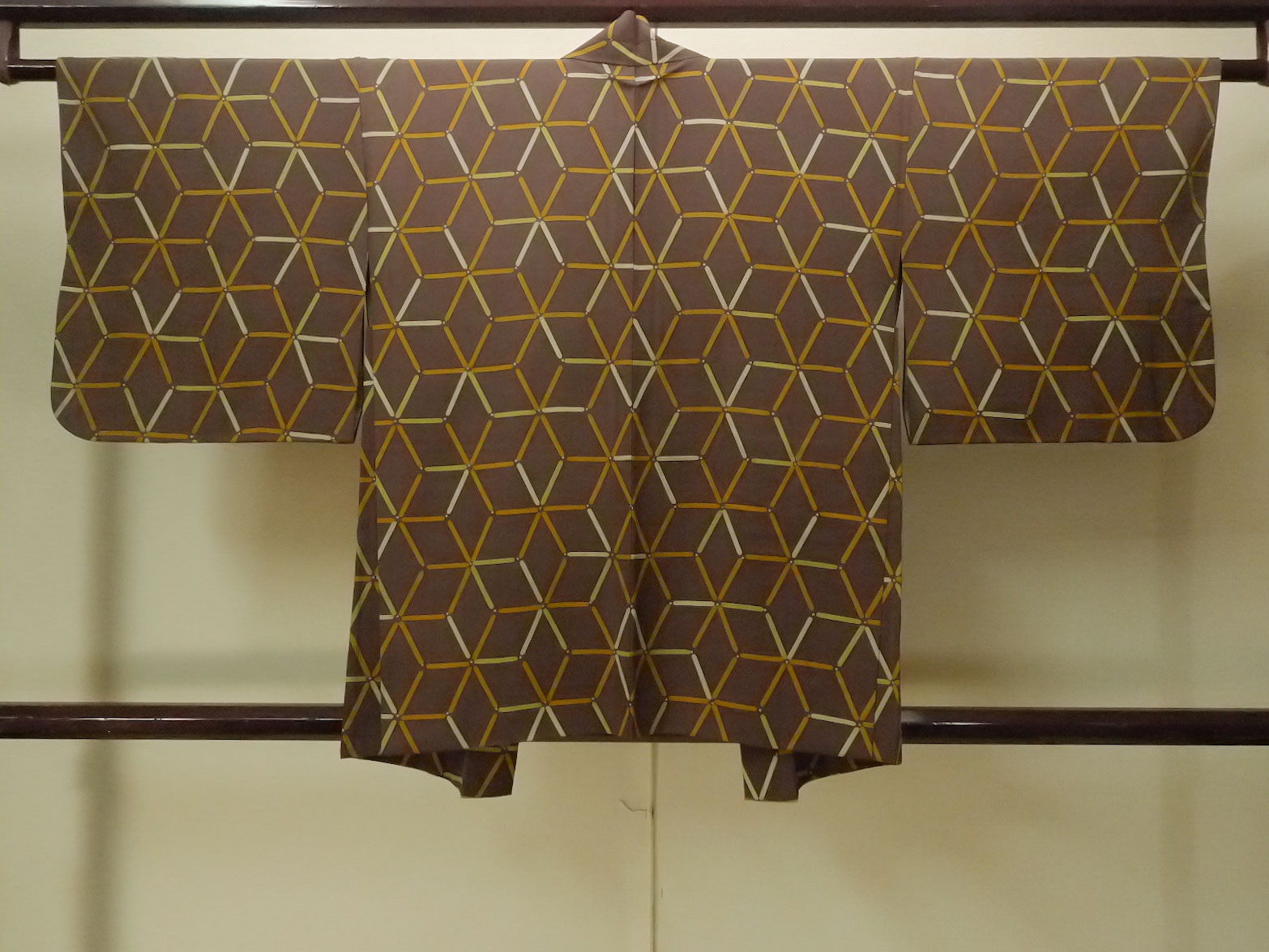 Kimonoya Japan : P0123T Vintage Japanese kimono Brown HAORI short jacket for women / Silk. Hemp leaf (Grade B) / Haoris