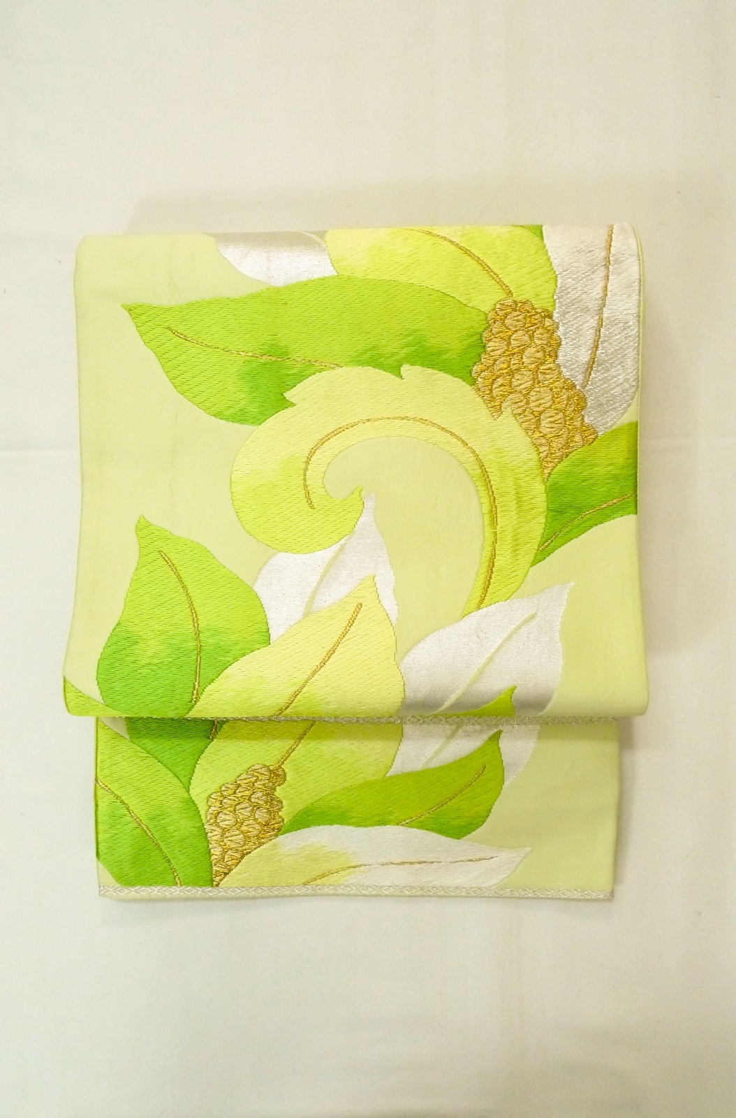 Kimonoya Japan : P0206E Vintage Japanese Kimono Pale Yellowish Green FUKURO OBI sash Leaf Silk. (Grade B) / Obi belt