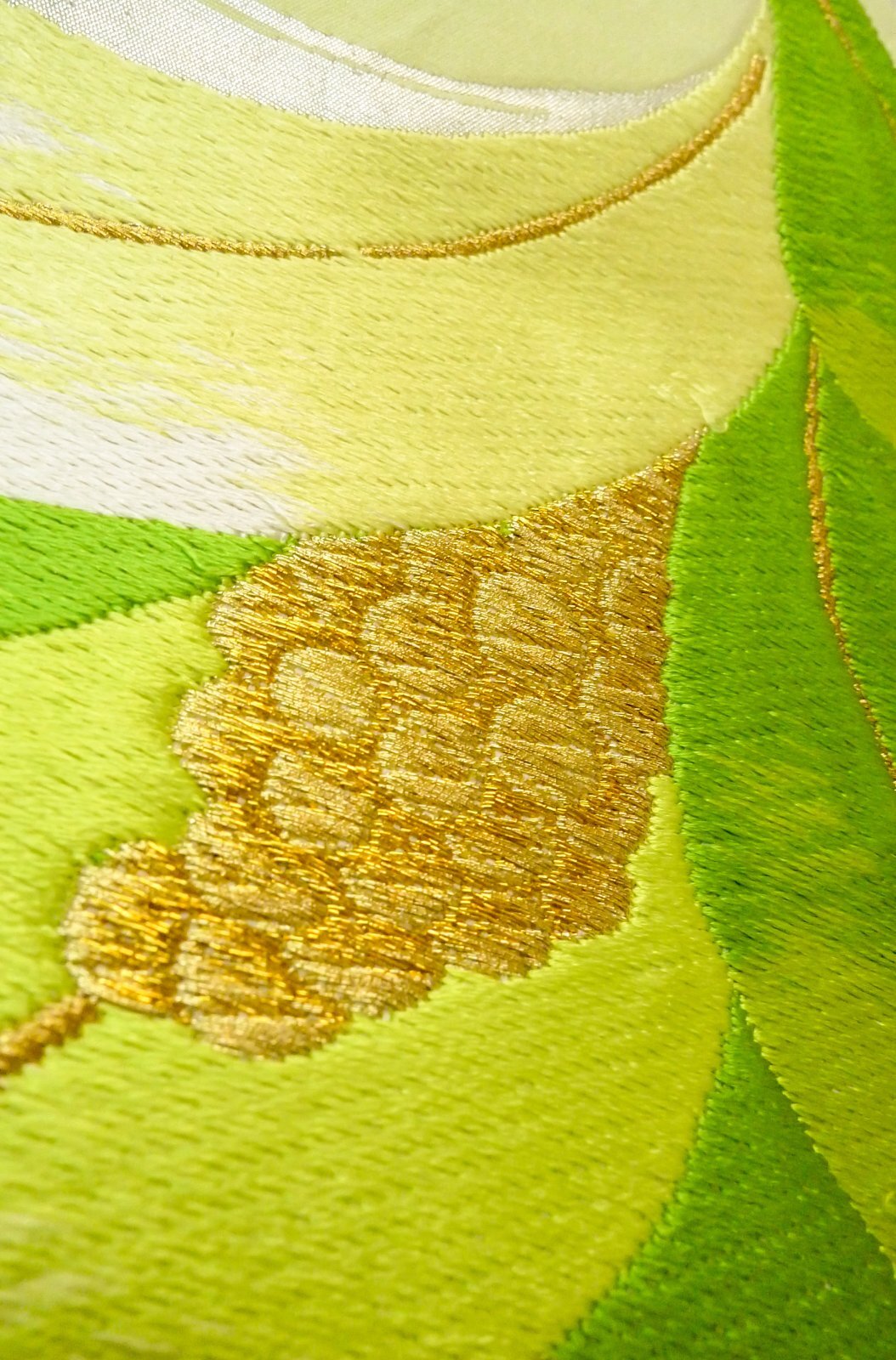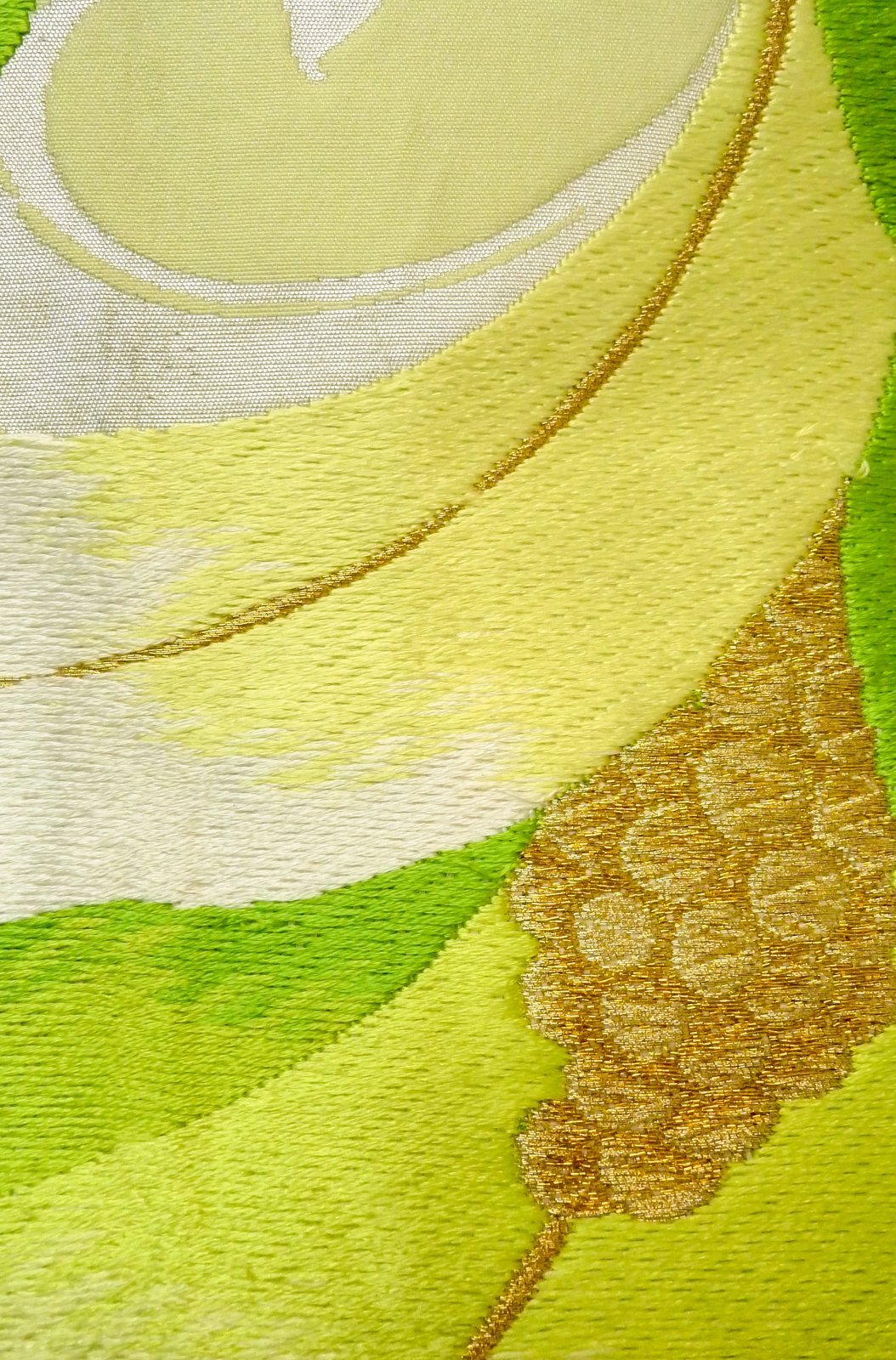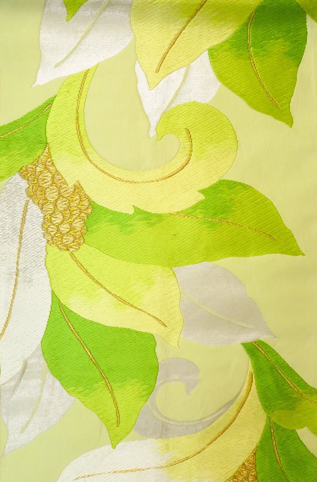 - > P0206E Vintage Japanese Kimono Pale Yellowish Green FUKURO OBI sash Leaf Silk. (Grade B)