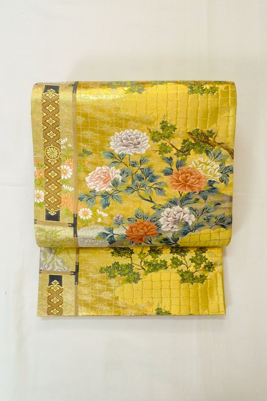 Mint P0206F Vintage Japanese Kimono Shiny Gold FUKURO OBI sash Peony Silk. (Grade A)