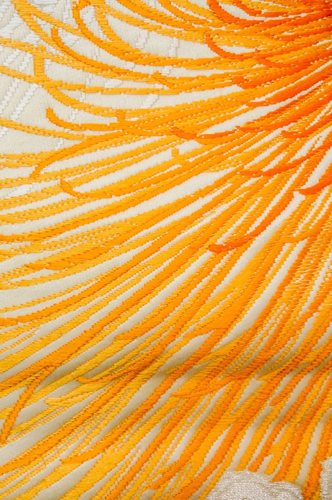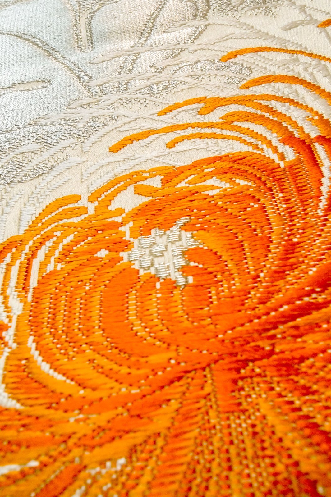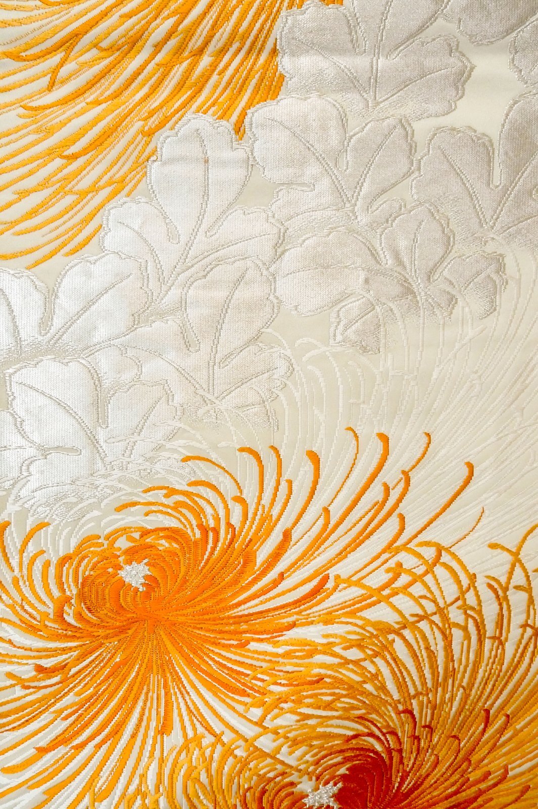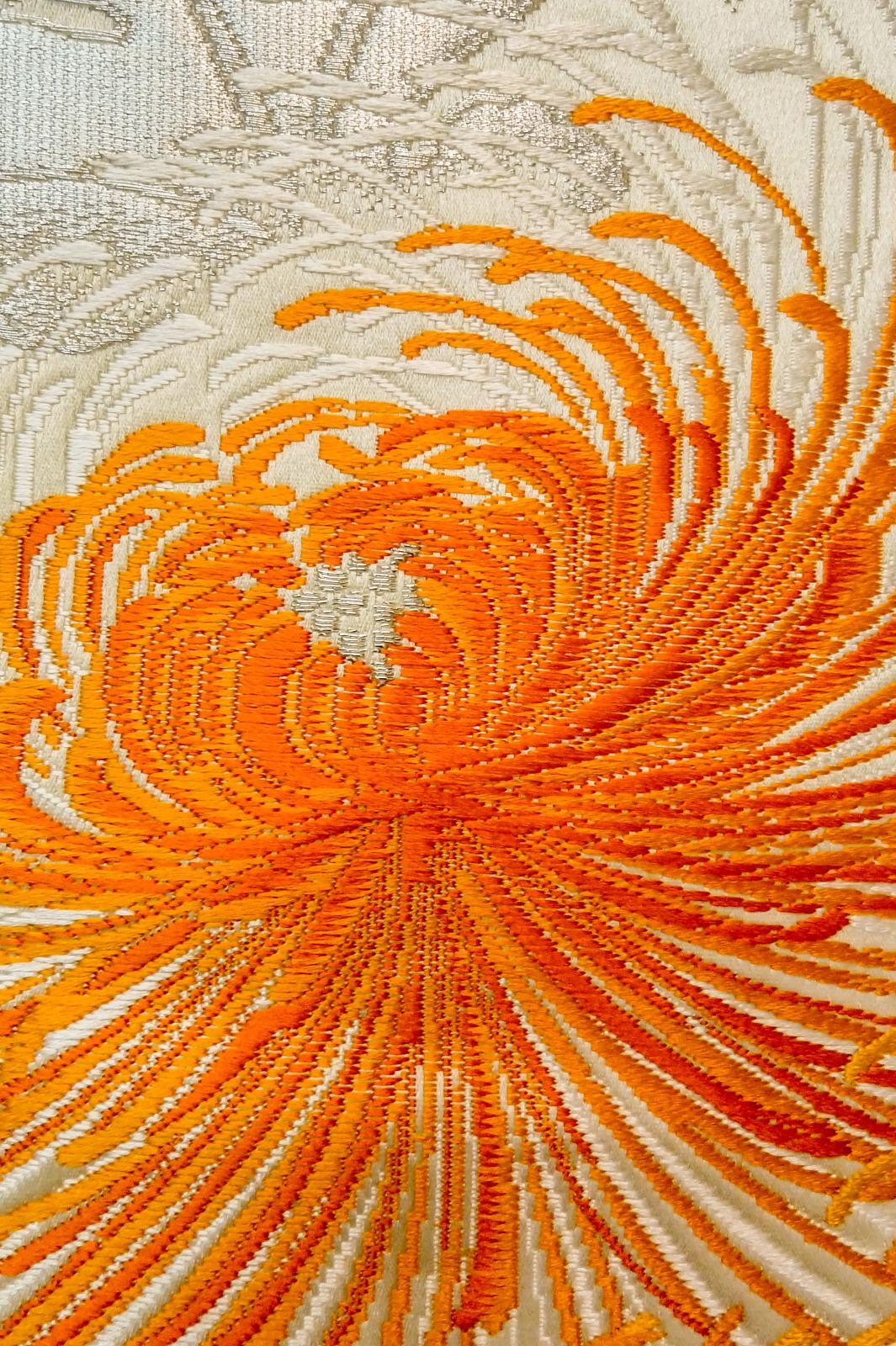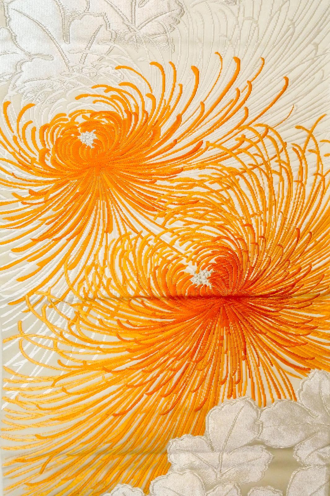 - > P0206H Vintage Japanese Kimono Shiny Off White FUKURO OBI sash Chrysanthemum Silk. (Grade A)
