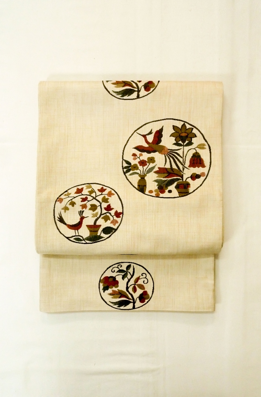 P0206Y Vintage Japanese Kimono Pale Ivory FUKURO OBI sash Flower Silk. (Grade A)