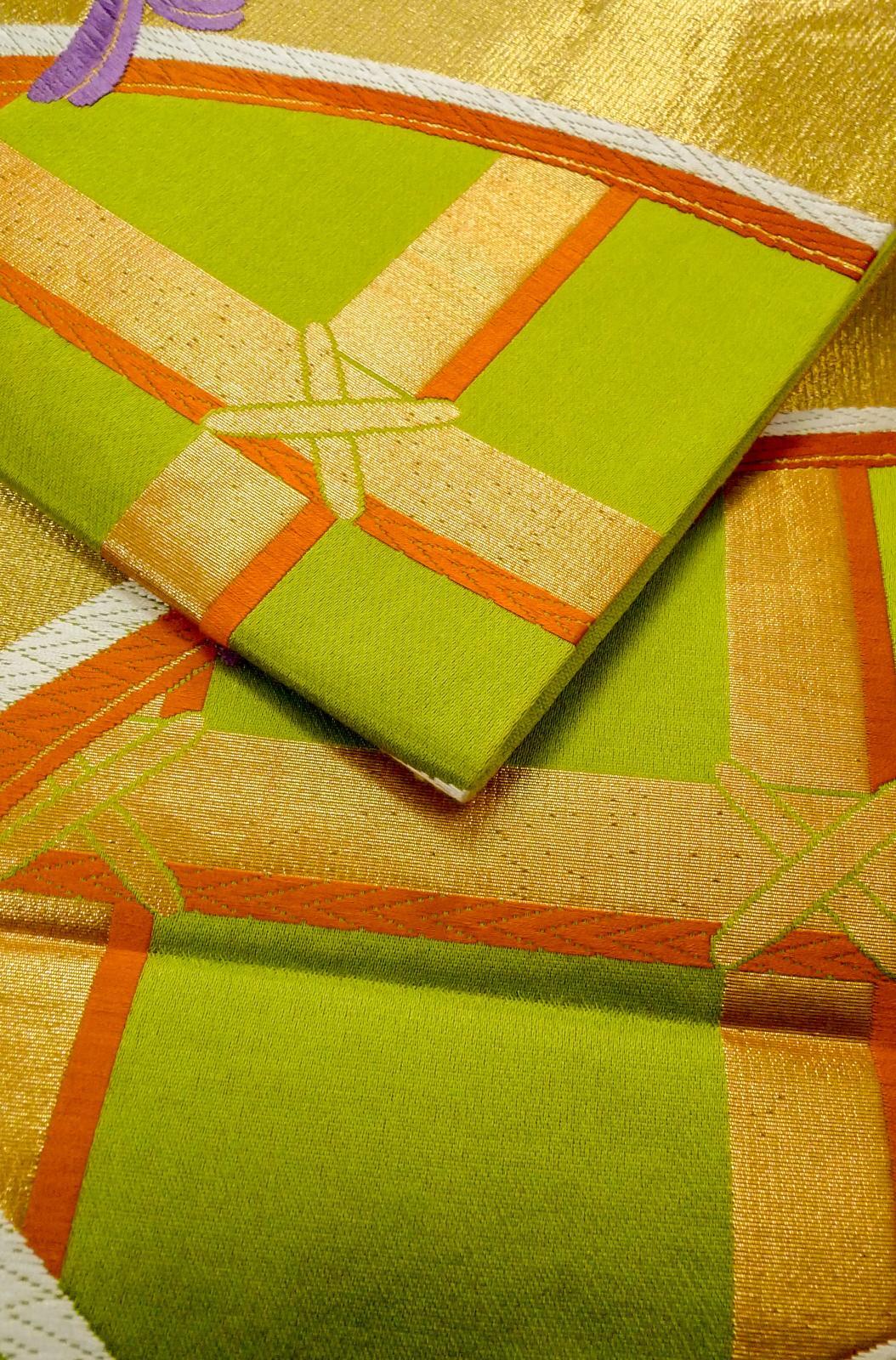 - > P0207D Vintage Japanese Kimono Yellowish Green FUKURO OBI sash Line Silk. (Grade B)